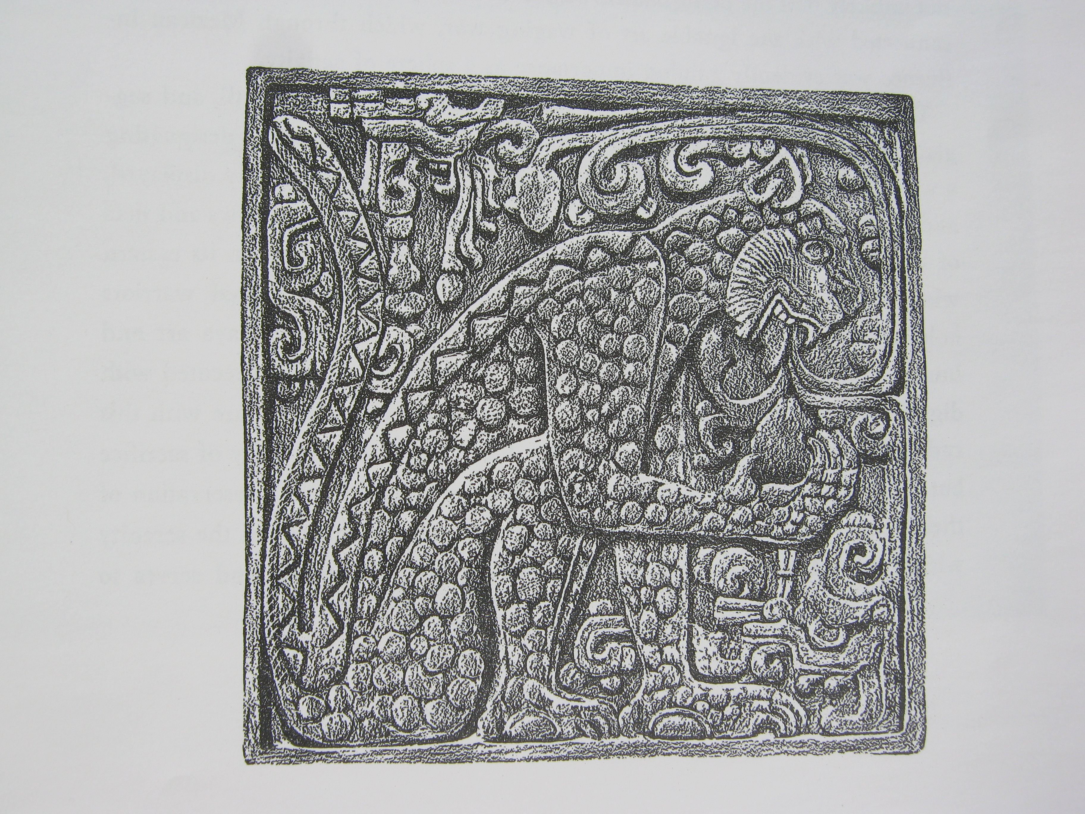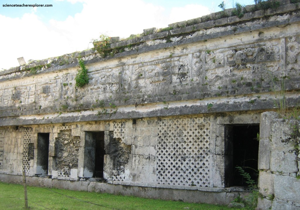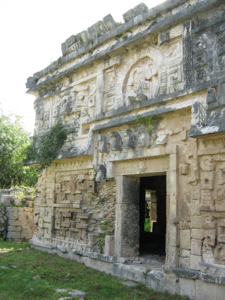 There was much interesting detail here, especially in the form of Chac masks. A doorway in the east face of the annex formed the open mouth of a monster, a feature associated with the Chenes style, although the rest of the structure was in Puuc style. The upper level of the Las Monjas had some carved lintels still in place. As mentioned and pictured above, the entrance resembled a cavernous mouth below a dignitary seated on a sky-band inside a niche of arched feathers. There is a long inscription above the door.