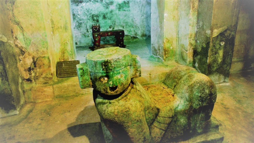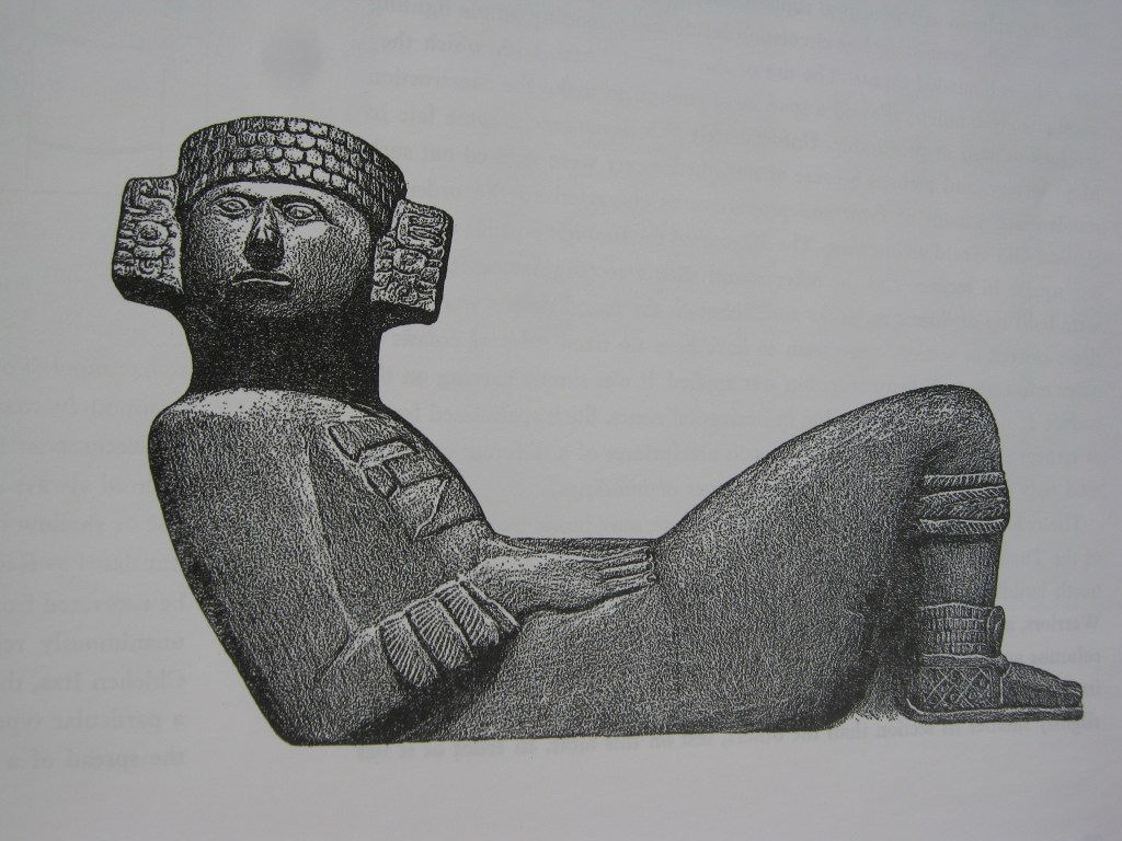 Imaged above, this type of statue (the Chac Mool) is not found in the southern Maya area, but common in many other regions from central Mexico to Costa Rica. It is a semi-recumbent figure, lying in a preposterously uncomfortable position, with its head always sharply turned over one shoulder. It holds on its body a round disc or shallow basin, possibly a repository of offerings. The name Chac Mool, translated as Red Tiger, which seems to point to the spread of a specific religious cult previously unknown among the Maya.