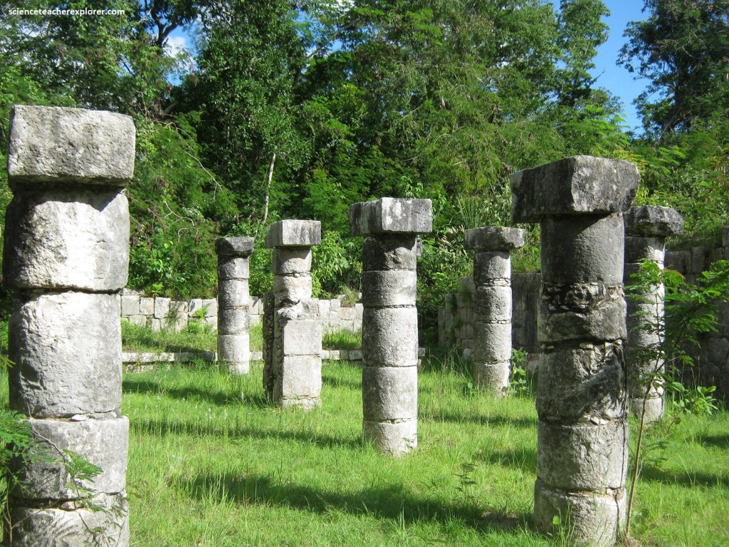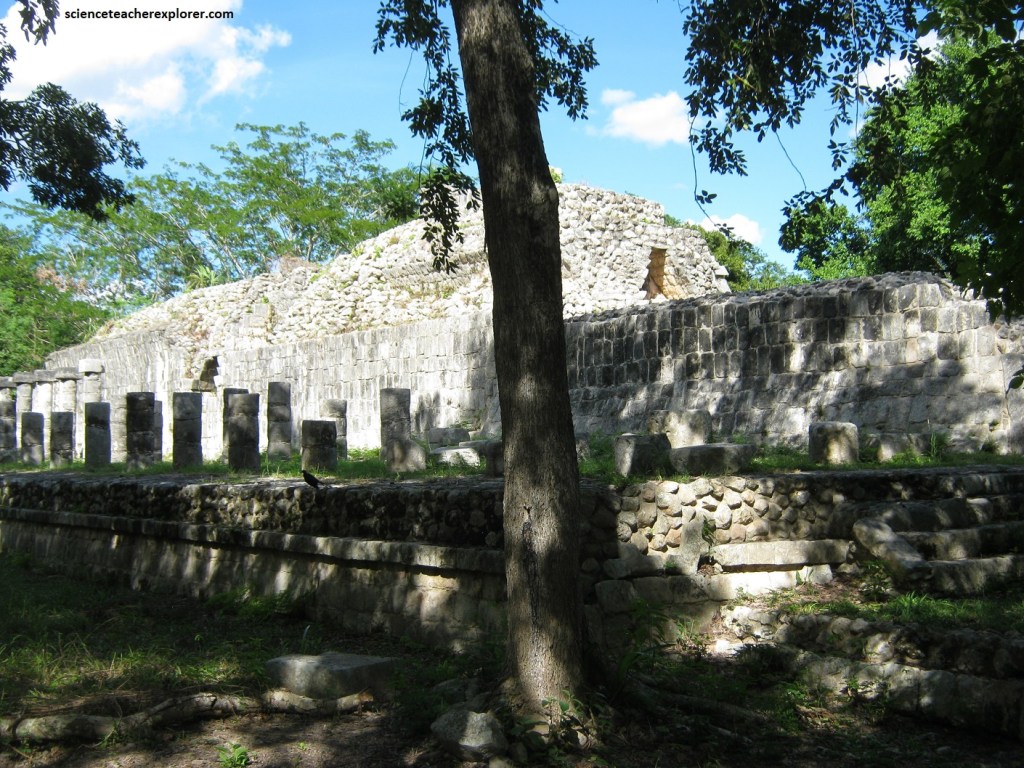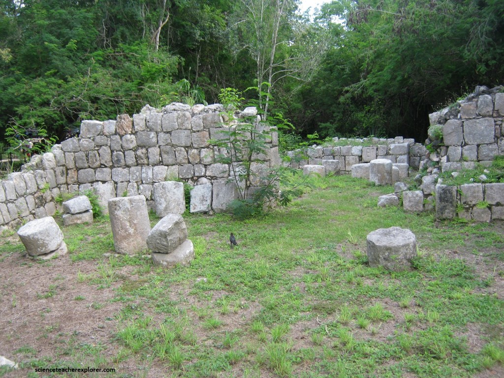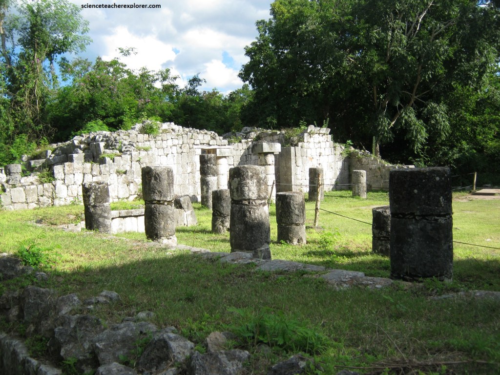 Pictured above, on the southside of the courtyard is the Mercado or Market. It was built on a slightly elevated platform. There was an interesting carved altar in this area and a square patio surrounded by tall columns with simple capitals. The perimeter of the patio was probably roofed with thatch, (imaged below).