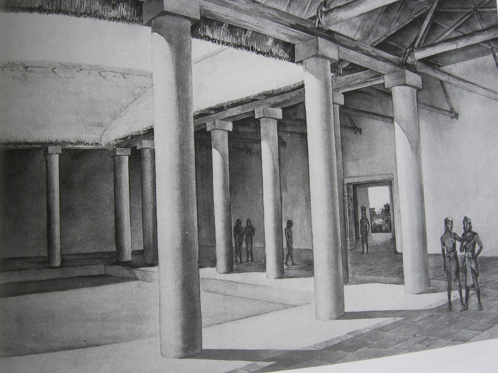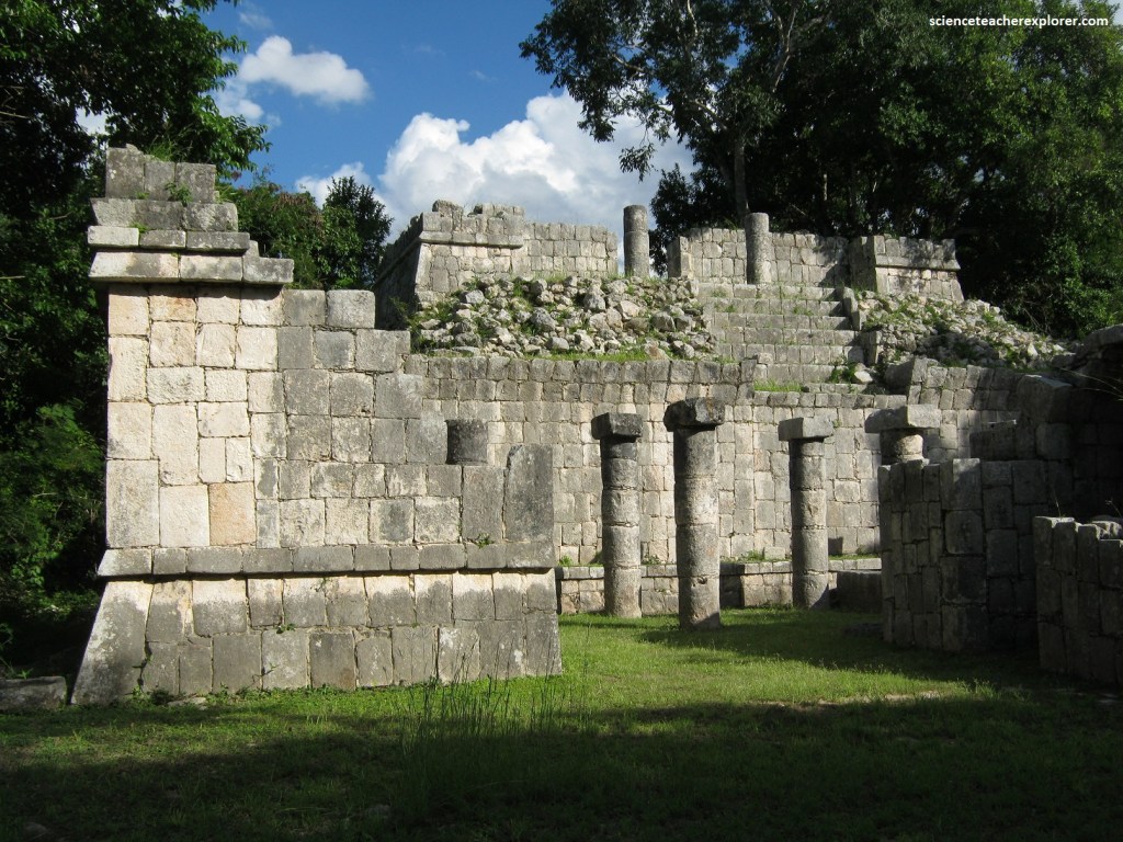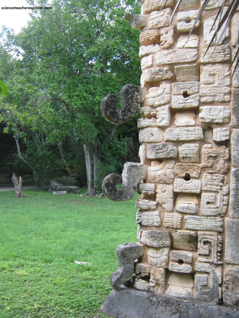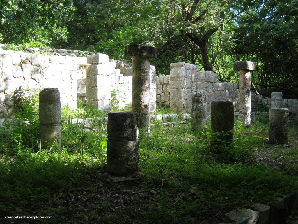 Pictured above, on the southside of the courtyard is the Mercado or Market. It was built on a slightly elevated platform. There was an interesting carved altar in this area and a square patio surrounded by tall columns with simple capitals. The perimeter of the patio was probably roofed with thatch, (imaged below).