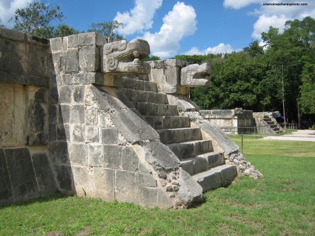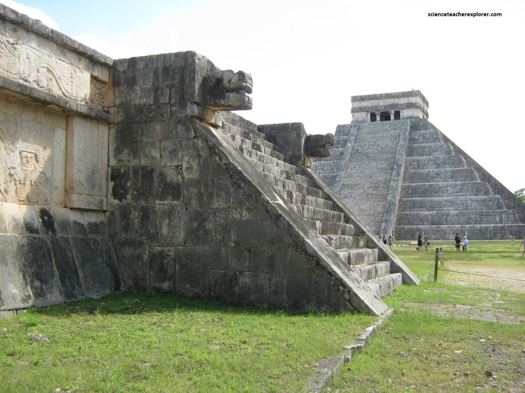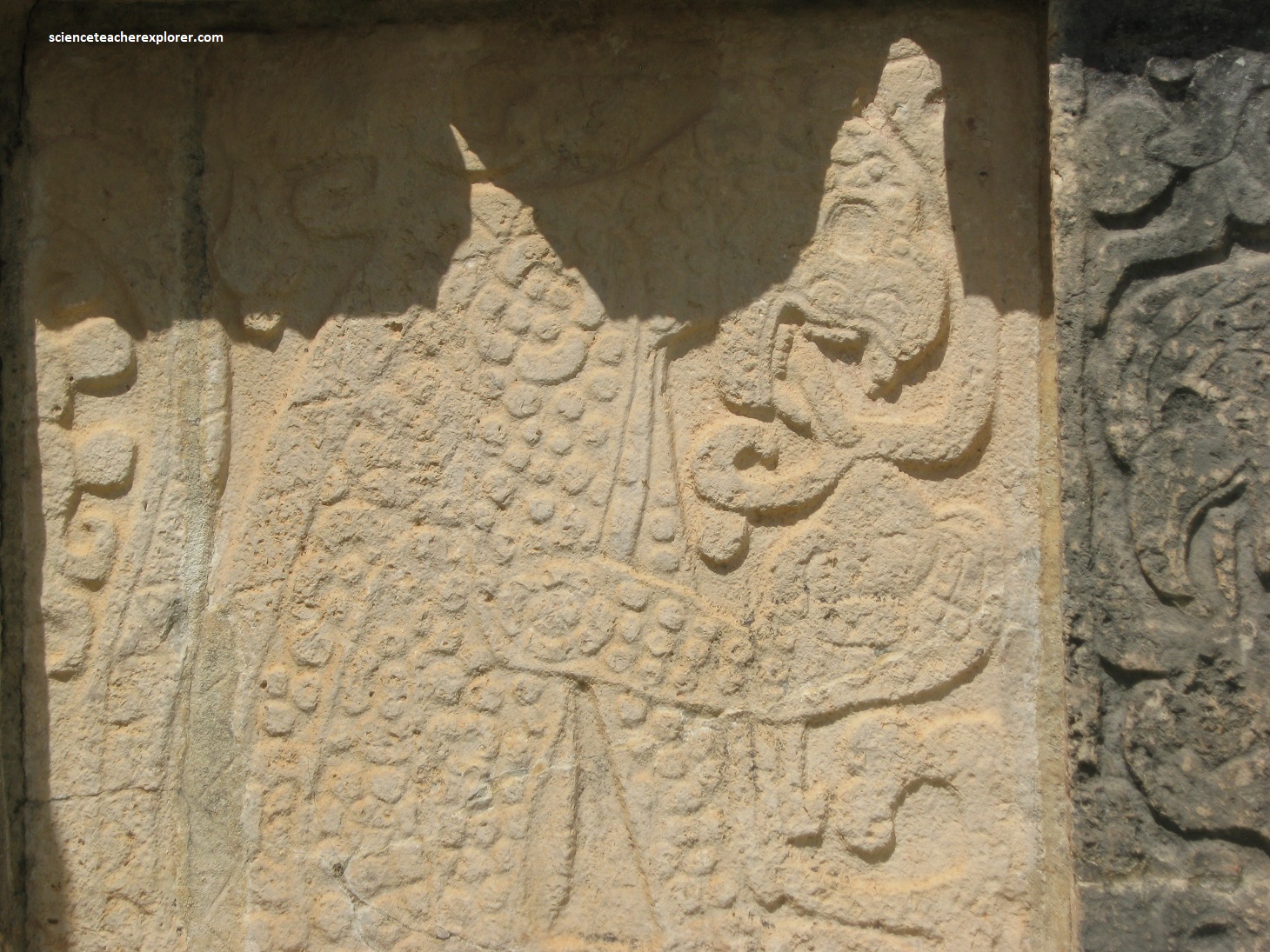 Pictured below, thousands of visitors show to see the effect of light and shadow on the northern staircase at the equinoxes, (equinox hierophany). On lookers see the setting sun cast a shadow from the terraces of the northwestern corner of the pyramid onto the western side of the balustrade of the northern staircase. At the climax of the display, the sun illuminates a continuous zigzag running from the top of the pyramid to its base, where the balustrade terminates in the head of an enormous snake that is also bathed in sunlight. In this way the sun creates the luminous body of the divine Kukulcan, (the feathered serpent). Kukulcan is the Maya name for the Aztec deity Quetzalcoatl, who was strongly associated with the planet Venus.