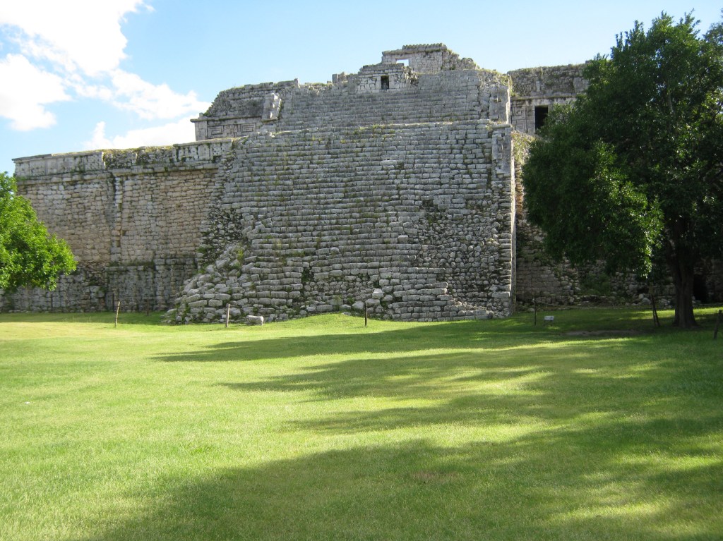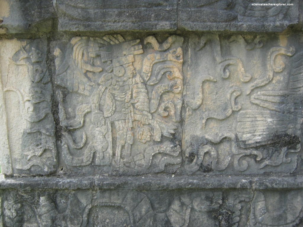 Although mostly ruined, the Ossuary, (or the Grave of the High Priest), is similar in design to El Castillo, though built on a smaller scale, (pictured above). There are remains of serpent columns on top, pillars carved with human figures, and the temple walls. near the base of the Ossuary are some carved-stone panels.
