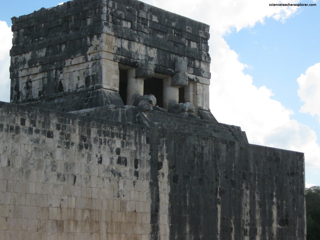 Pictured above, even more interesting is the Temple of the Jaguars on top of the south end of the east wall of the ball court, and reached by a steep stair. The roof of the temple is supported by carved serpent columns similar to those at the Temple of the Warriors, and in an inner chamber there area a few fragments of murals. A carved wooden lintel spans the doorway to the inner room.