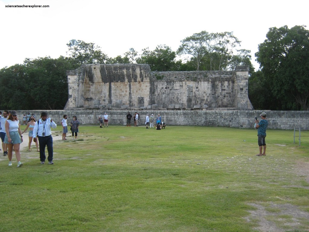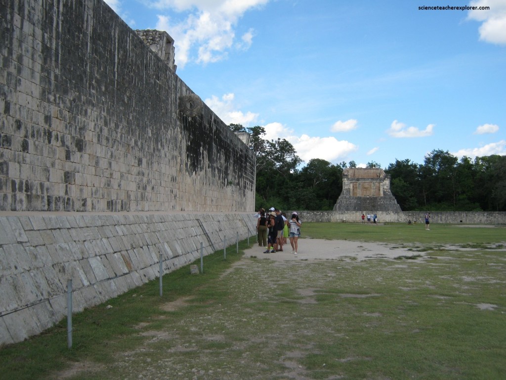 The video above and pictured below, a small temple lies at each end of the ball court, and from in front of the north temple (the Temple of the Bearded Man) a person speaking in a natural voice reportedly can be heard at the other end of the court, about 150 meters away.