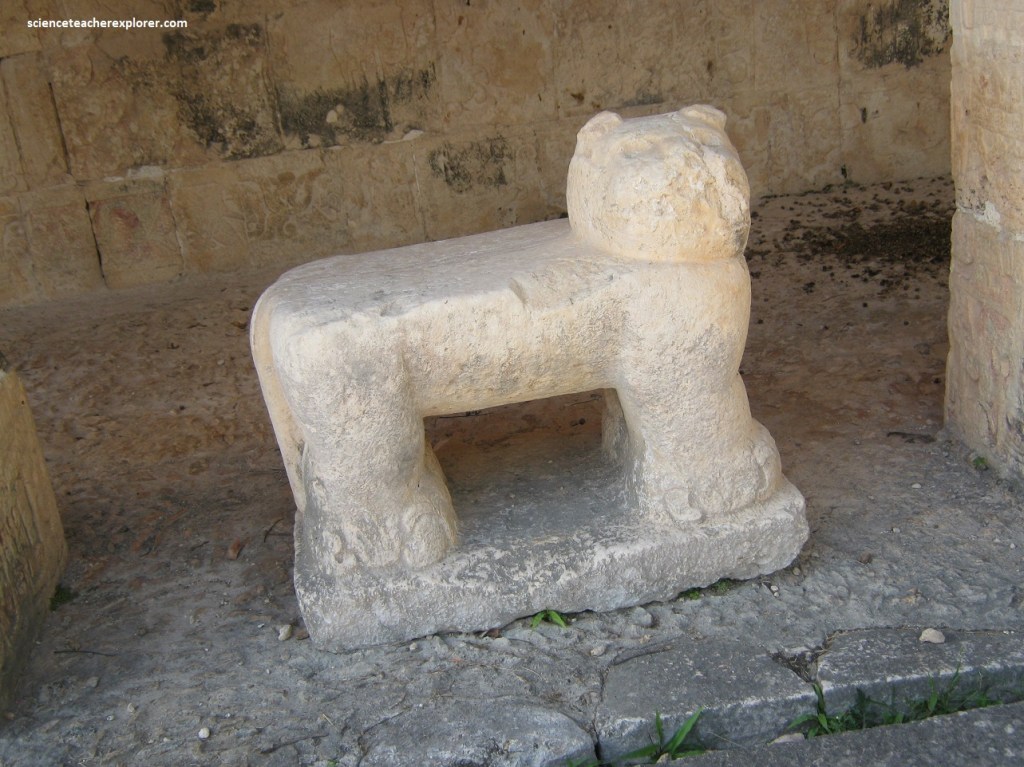 Pictured above, on the first level and facing east of the Temple of the Jaguars, had a room that was polychromed with bas-reliefs on pillars, walls, and vault in a goo state of preservation with a simple three dimensional sculpture of a jaguar, (possibly a throne).