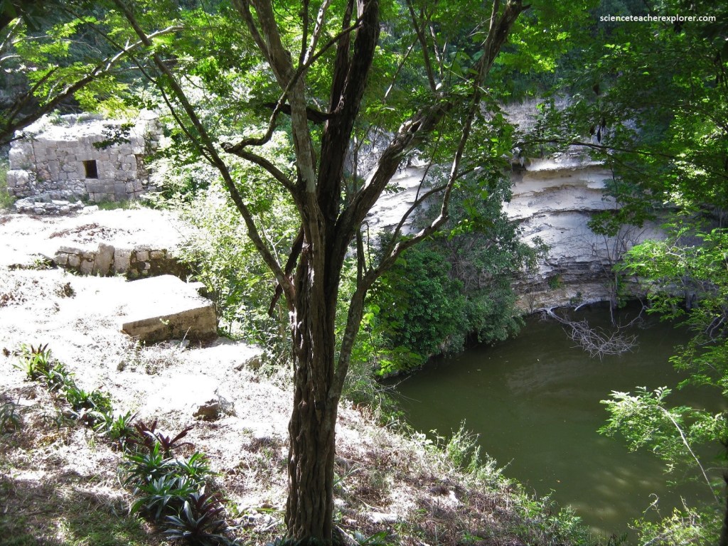 Pictured above, the Venus Platform was a square platform that had a stair on each of its four sides and may have been used as a dance platform. It was decorated with bas-relief sculptures and three-dimensional serpent heads. Due north of the Venus Platform we came to a trail (built atop an ancient Maya “Sache”) that continues north 300 meters to the Sacred Cenote, (pictured below).