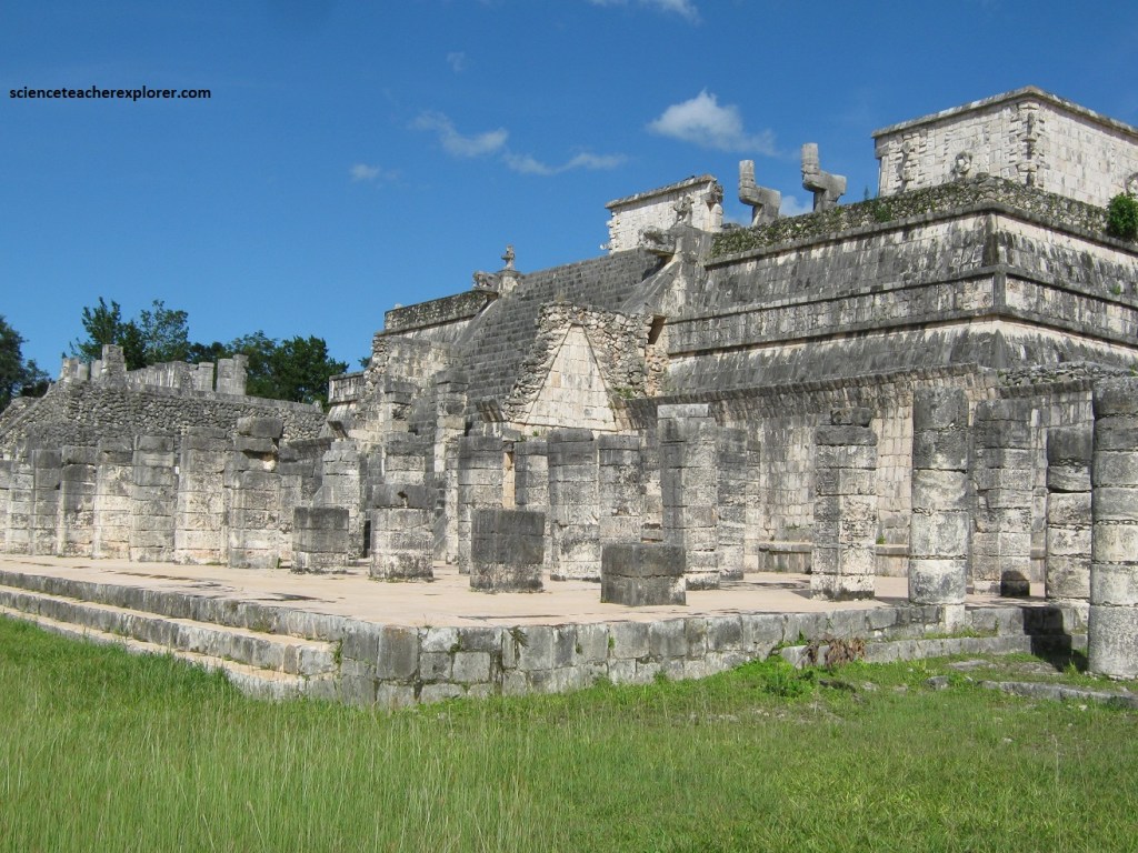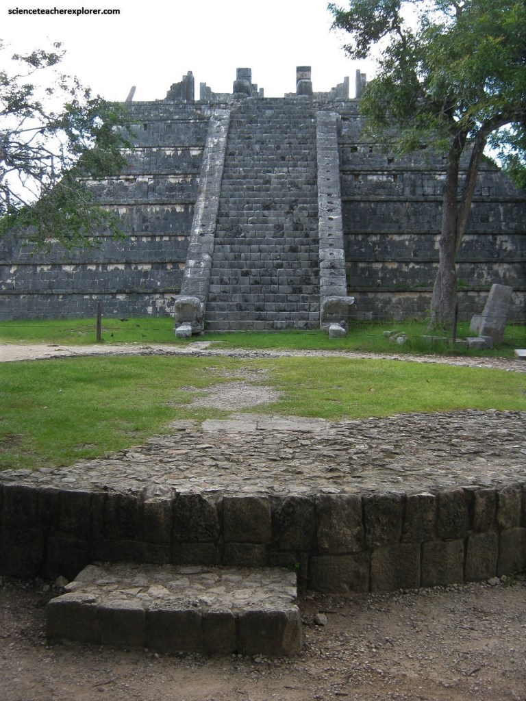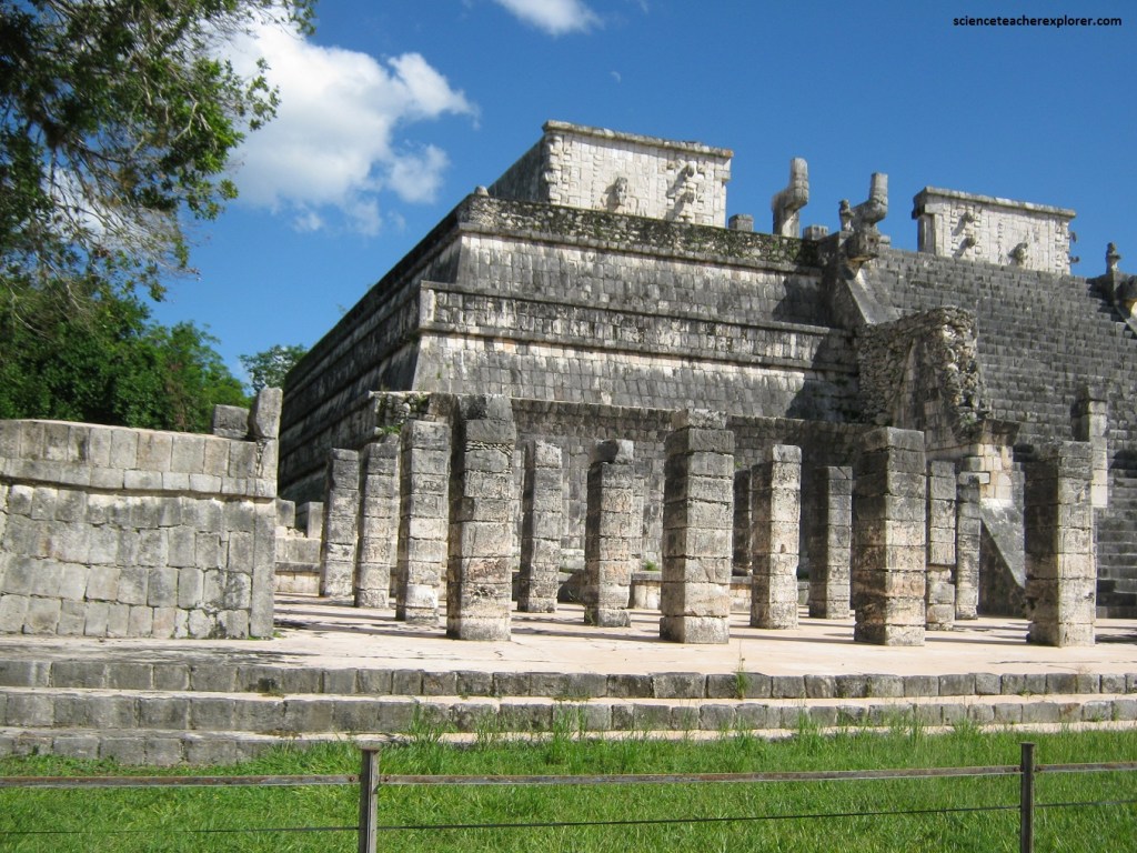 The top of El Castillo was a good spot for videos or photos of the Temple-of-the-Warriors, which lies to the east. Pictured below, the “Temple-of-the-Warriors is composed of a pyramidal base rising in three tiers, with a temple on top, approached by a stairway on the west side. There was a large colonnade of stone pillars carved with figures of warriors at the base of the structure on the west side.