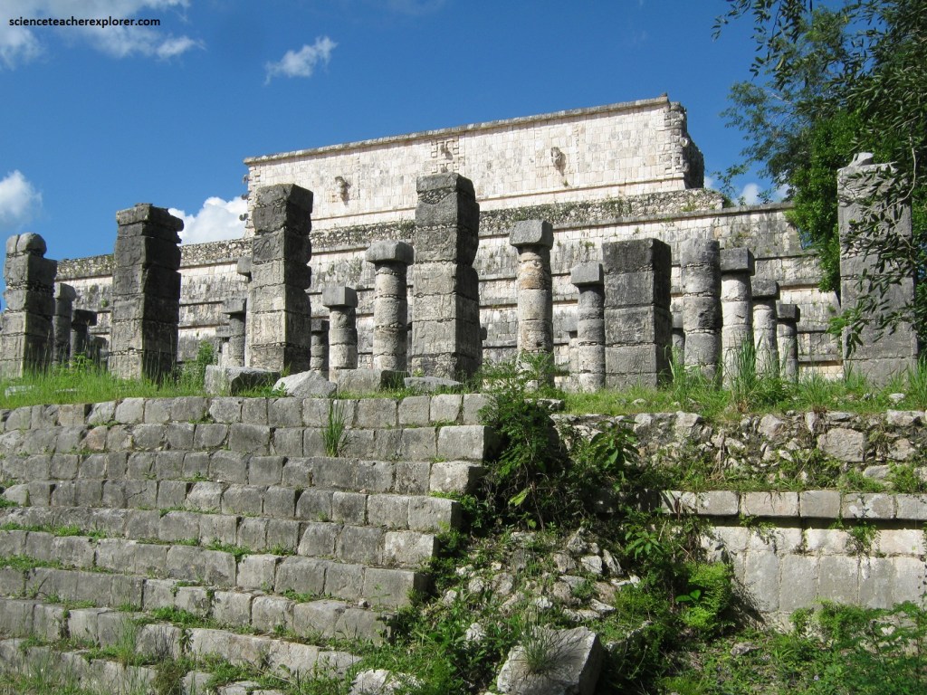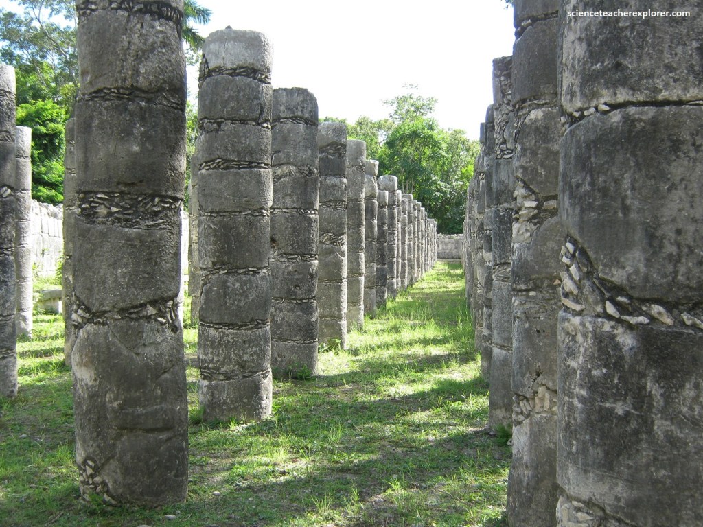 Pictured above, a large courtyard adjacent to the south of the Temple-of-the-Warriors, was surrounded by numerous ruined buildings know collectively as the “Group-of-the-Thousand-Columns”. The many columns were originally roofed over, forming a colonnade part way around the courtyard.