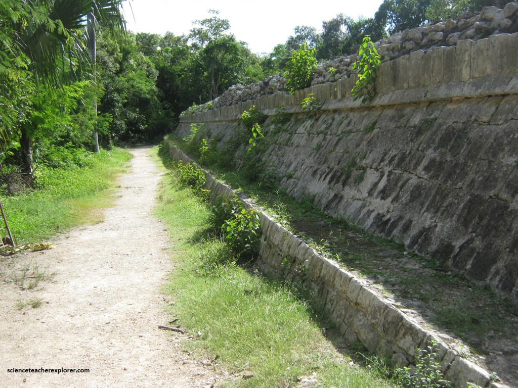 Pictured above, Sacbe 5 is a road which connected the Northern Plaza with the Observatory. It was built in three stages: the first two provided a simple line of stones outlining the road, while in the third stage there were walls, slightly higher than those observed today. The earth wall, dating from an earlier period, was probably built as a base for an enclosure or defense structure made of perishable material, and eventually connected Sache 5 with the northern side of the Temple of Xtoloc. It was built out of re-used stones, of which there are many column bases and decorated stones.