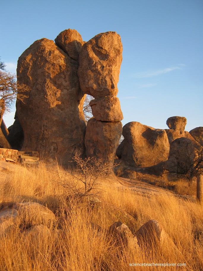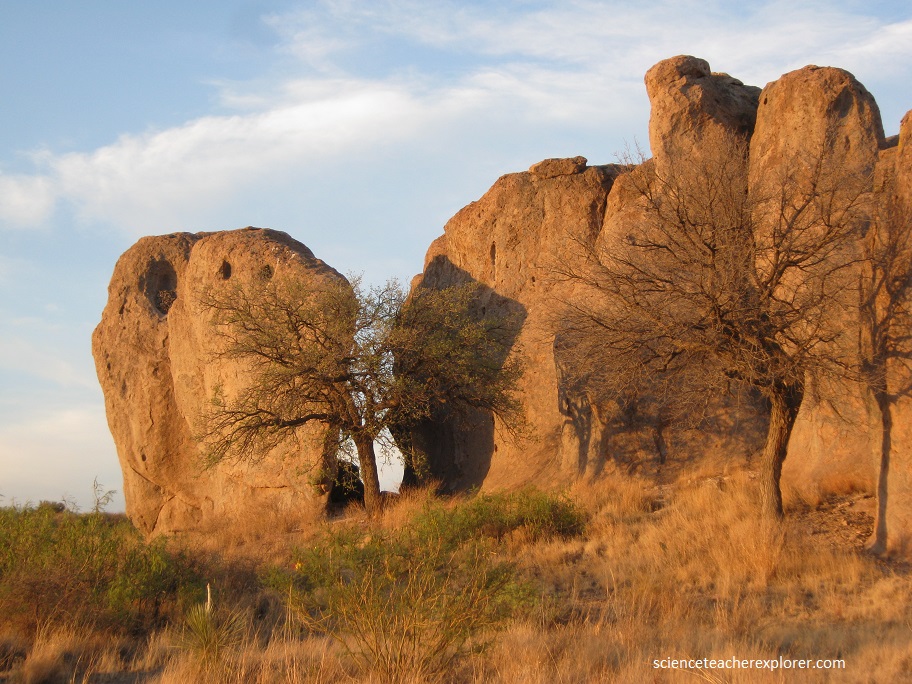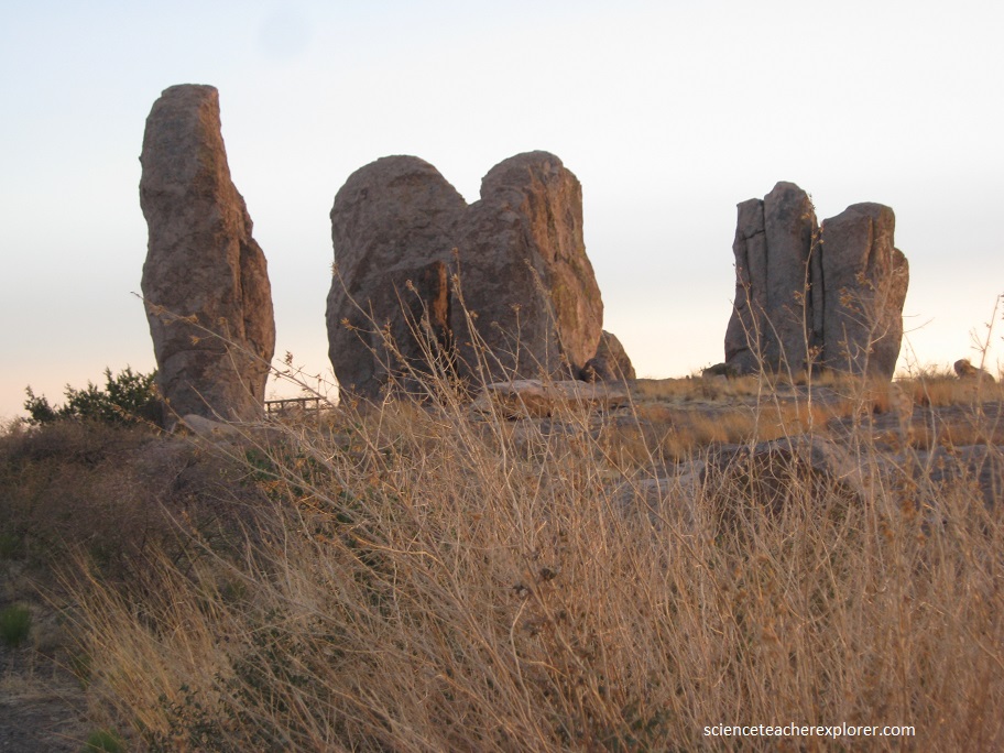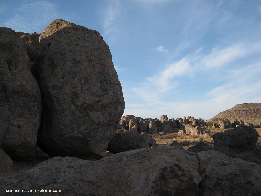 The ash-flow tuff at City of Rocks is part of the Kneeling Nun Tuff. In many areas, the ash fragments in the layer were hot enough to compact and weld together, forming the solid lava-like rock exposed. Cooling and contraction of the tuff formed a pattern of vertical cracks called columnar jointing. The “streets” in City of Rocks are formed by orthogonal fractures. More than one mechanism formed the fractures that trend north-northeast, east-northeast, and northwest.