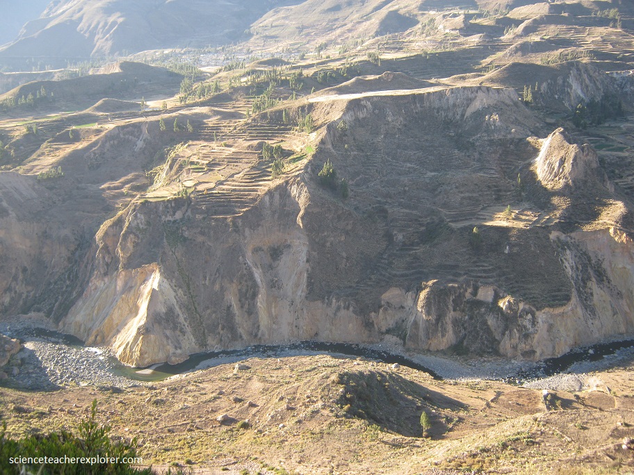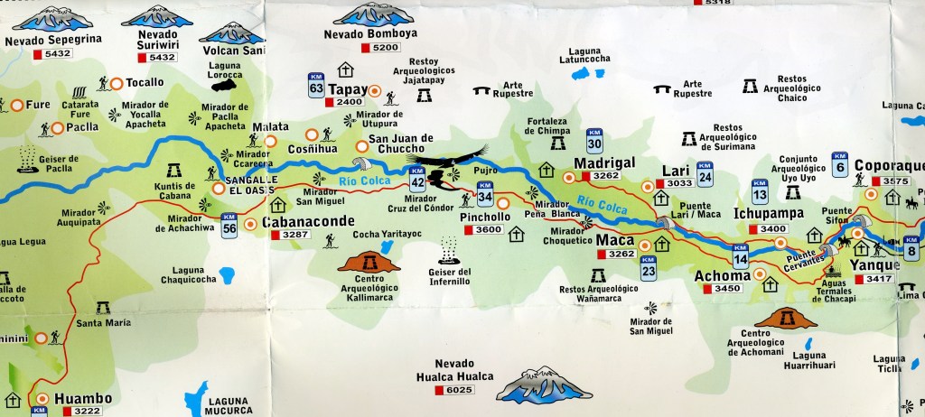 Since we got to the Cruz del Condor cliff top lookout in the late afternoon we continued to the village, Cabanaconde 12 km away to spent the night. Besides, to get a look at any Condors, we had to view them in the morning. Cabanaconde sits on the canyon’s rim and, it is possible to descend, via a precipitous zigzagging path, to an oasis of fruit trees aside the narrow Colca River 4km and 1,200 vertical meters below to Sangelle, a natural oasis. We decided not to, because of the hike-out would of been too time consuming and we would of missed the morning Condor flights again.
