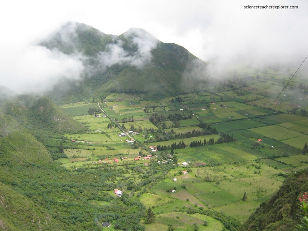 The Pululahua Geobotanical Reserve is a protected area around Pululahua Volcano, 17 km north of Quito. The most notable feature of this site is “el crater de Pululahua”, which is one of only two volcanic craters in the world inhabited by humans (and the only one that is farmed). This reserve was shrouded in a thick layer of clouds or fog the day we were there. The land here is extremely fertile because it is volcanic (igneous) soil and, as mentioned earlier, is used to cultivate crops, (pictured below).