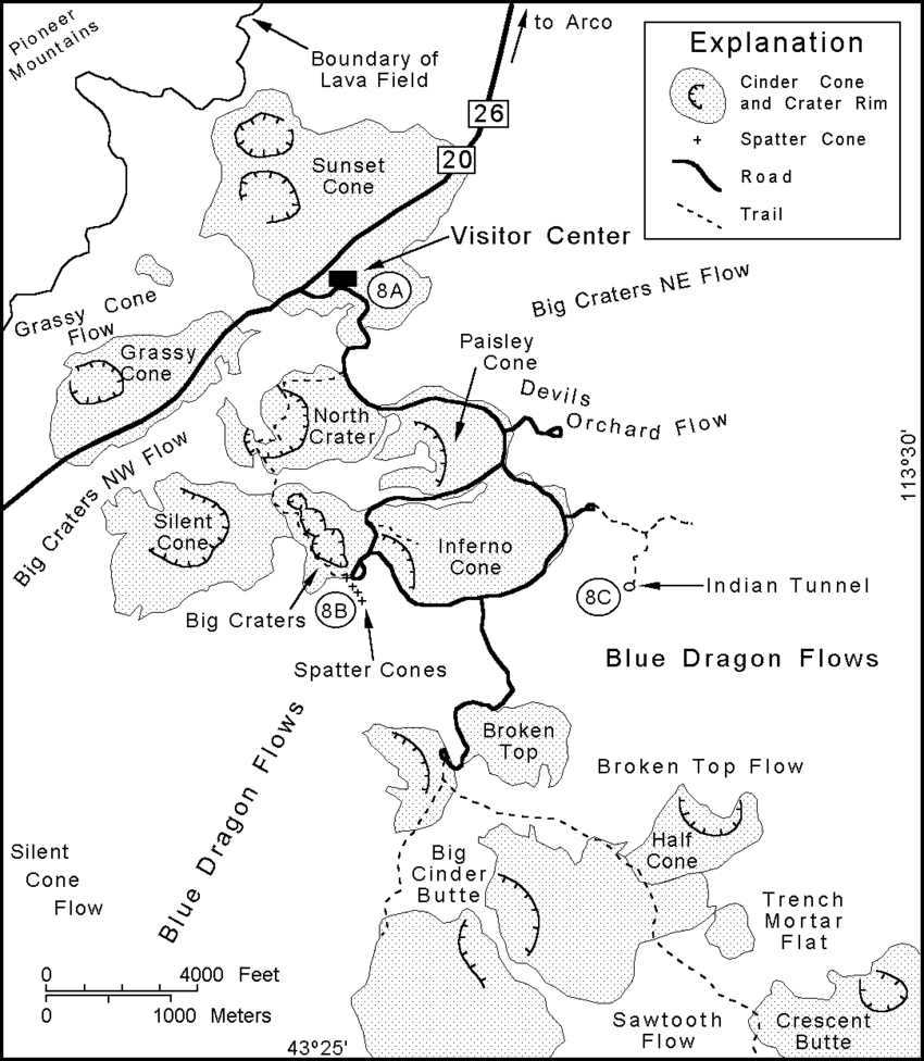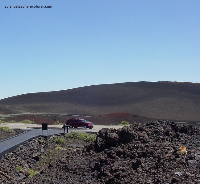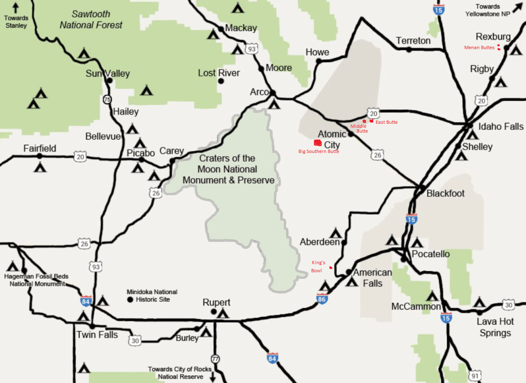 Image above, the main entrance to Carters of the Moon National Monument and Preserve lies about 29 km southwest of Arco, Idaho and is easily accessed from combined US20/US26/US93. There is 11 km paved loop road to visit the variety of volcanic geo-sites.