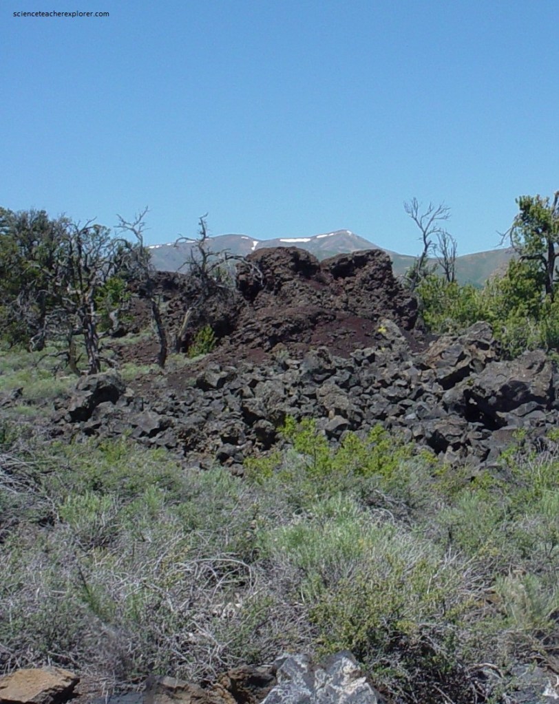 Pictured above, shield volcanoes, (broad, low lava cones), are less obvious the either cinder or spatter cones, but they occur at the Craters of the Moon also. They are formed by very fluid lava that spills from vents onto an essentially flat surface and flows outward in all directions.