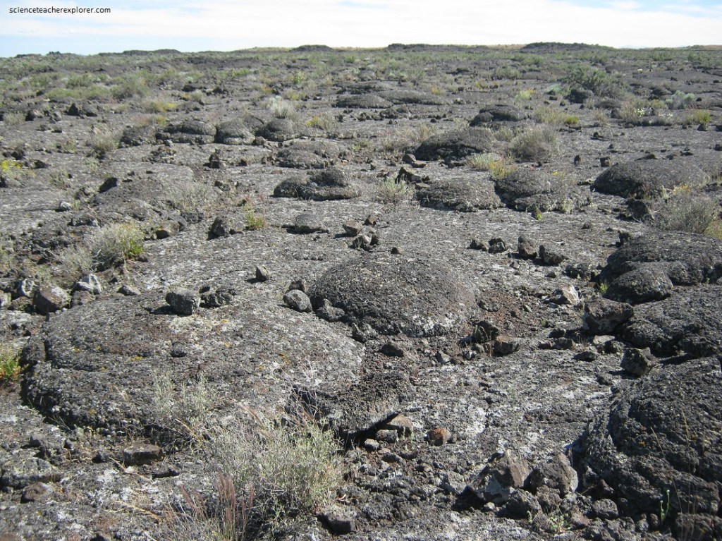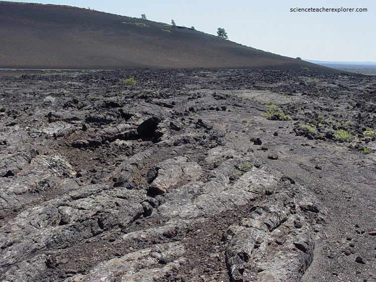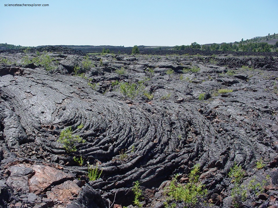 Pictured above, lava flows of 2 types were recognized ad named by Hawaiian natives long before the advent of geologic studies at the Craters of the Moon National Monument. The Hawaiian names: a’a and pahoehoe.