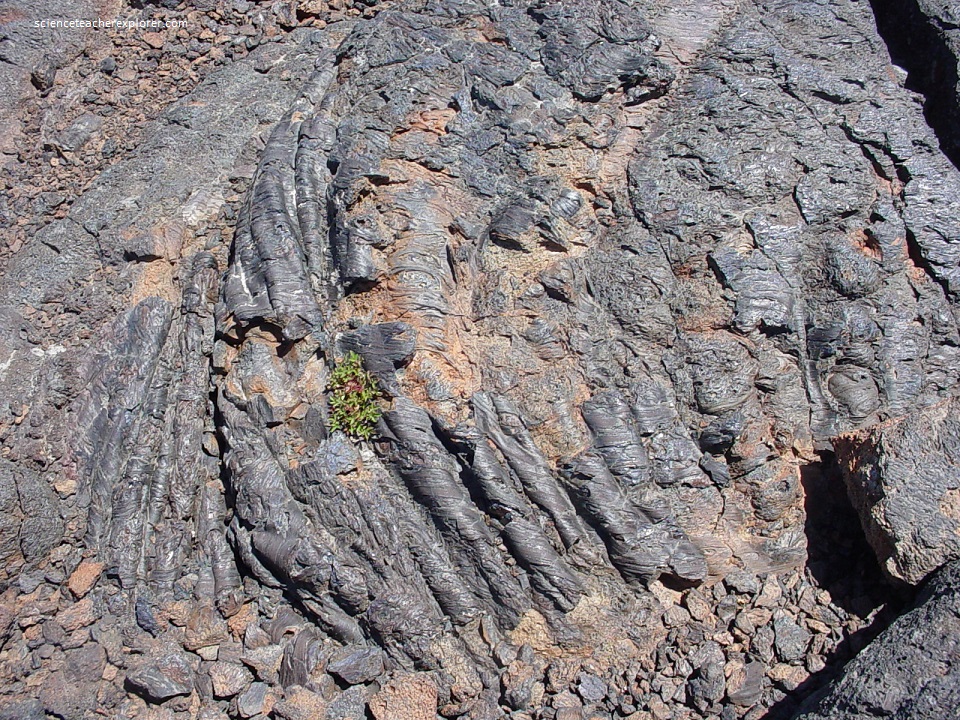 Pahoehoe lava cools with an undulating, continuous surface that may be wrinkled or ropy. Lavas that form it are very hot; because their outside “skin” cools to plasticity even while the still-molten interior continues to flow, it commonly twists and folds with remarkable pliability.