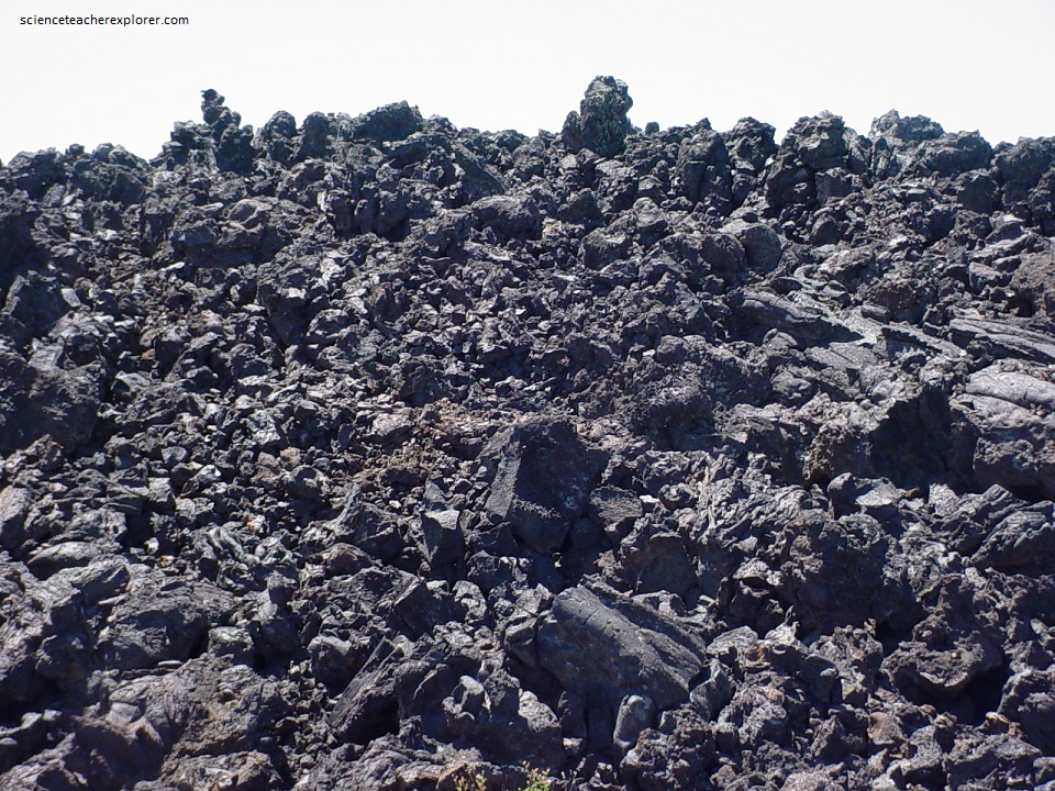 Pictured above, a’a lava has a rough, rubbly, quite obviously broken surface nearly impossible to walk across. It results from breakup of a thick, hard surface crust on a slow-moving, very thick and pasty lava flow. An aa flow advances at a crawl, (only a few meters an hour).