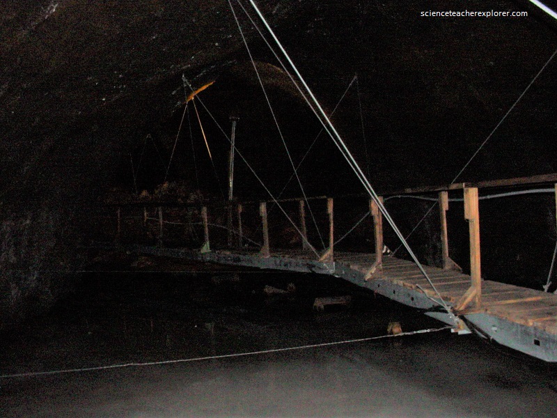 Imaged above, changes in the temperature and quantity of air flowing in and out of the caverns determine the amount of ice present. The historic tour entrance in now closed for safety reasons. Falling rocks, unstable walls, and cracks hundreds of meters deep are all hazards found in the underground area.