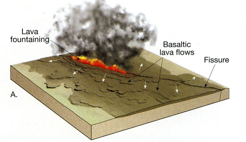 Pictured above and below, depending on the amount of gas present and the width of the fissure, these eruptions may blast clots of lava, or spatter, tens or even hundreds of meters into the air, but ultimately they tend to be benign, producing expansive lava flows that inundate the surrounding landscape.