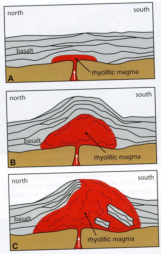 Pictured above, the eruption of “Big Southern Butte” begun about 300,000 years ago as an intrusion of rhyolitic magma pushed its way upward through basalt flows. (A) Rhyolitic magma rises and accumulates at the base of older basalt. (B) The continued intrusion, domes the basalt upward. (C) Rhyolitic lava oozes onto the surface on south side of Big Southern Butte. A steeply dipping basalt slab remains on the north side, while others sink, due to their density, into the buoyant rhyolite.