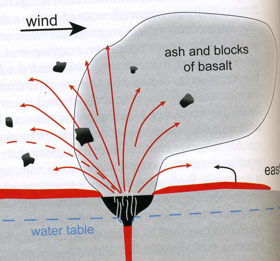 Throughout much of the fissure eruption, the pressure of rising magma kept groundwater from entering the fissure and mixing with the magma, resulting in the typical basalt lake. However, as the eruption waned, groundwater came in contact with hot magma and flashed to steam, creating tremendous gas pressure, (imaged above). Because this occurred relatively close to the surface, the steam pressure exceeded the weight of the overlying rock, and the resulting explosion broke chunks off the fissure wall and scattered them around leaving a massive hole in the fissure.