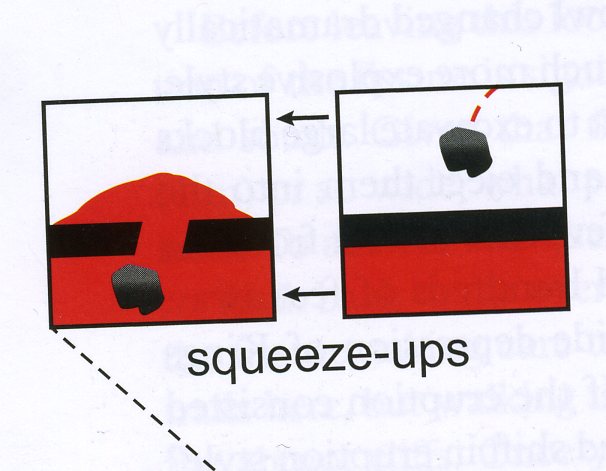 Pictured above, most of the squeeze-ups are somewhat conical in shape, resembling candy kisses or cow patties. A few angular blocks lie in holes with no accompanying squeeze-up.