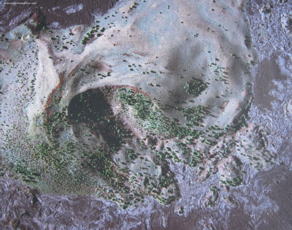 Three kinds of small volcanoes and two kinds of lava flows are represented here, all with counterparts in other volcanic regions.