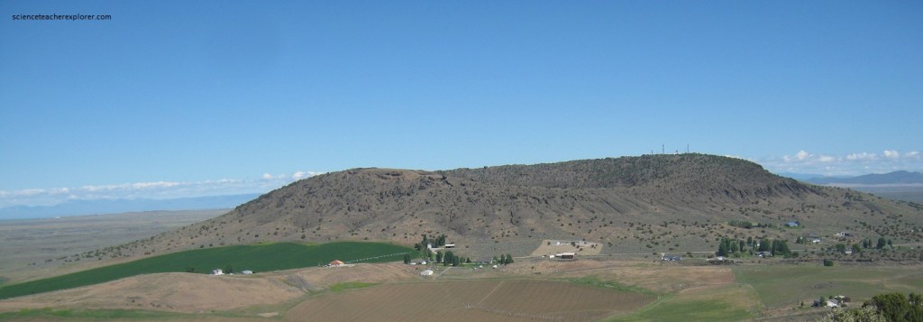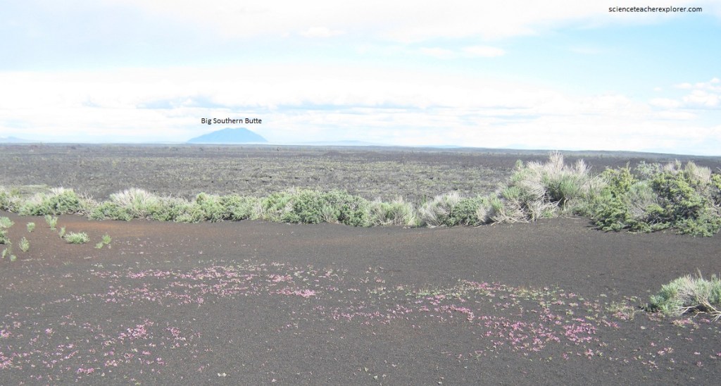 Picture above, an elevated island amid a vast sea of basalt, “Big Southern Butte abruptly rises 730 m above the desolate plain and has a diameter of about 6.4 km. This makes it one of the largest lava domes on Earth. Its steep slopes exceed 30 degrees in places.