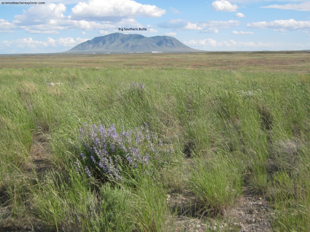 Most of the eastern Snake River Plain is virtually flat, thanks to the horizontal basaltic lavas that flowed out across older rhyolite over the past few million years. Subtle volcanic vents are hard to spot from the ground, particularly the inconspicuous low domes of shield volcanoes typically constructed by fluid basalt eruptions. Yet here and there we see a distinct butte rising from the plain whose origin is clearly volcanic. Examples include East, Middle, and Big Southern Buttes west of Idaho Falls, and Menan Buttes west of Rexburg, Idaho. {Note the purple Dwarf Monkeyflower in the foreground}.