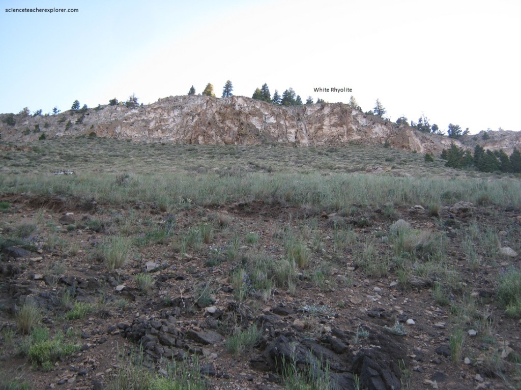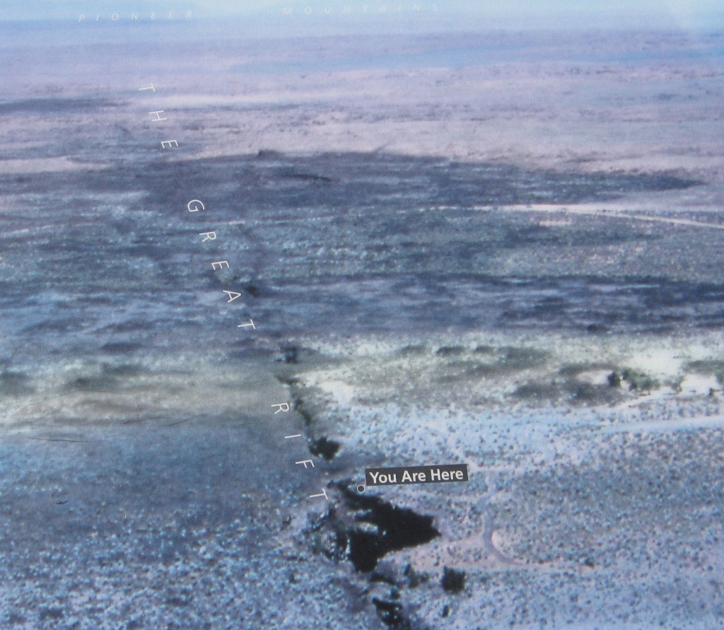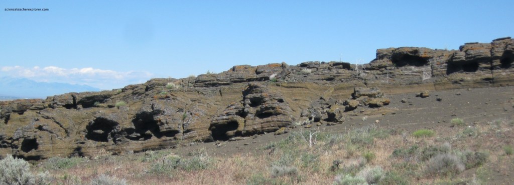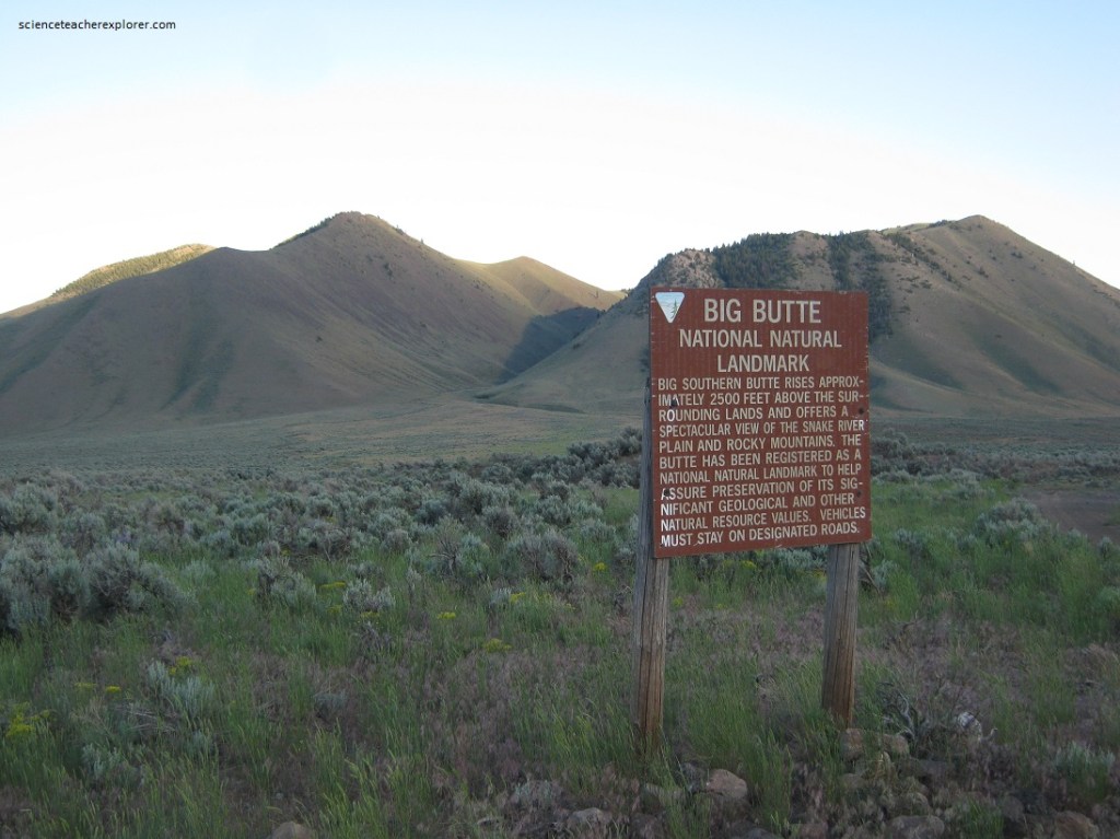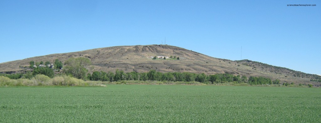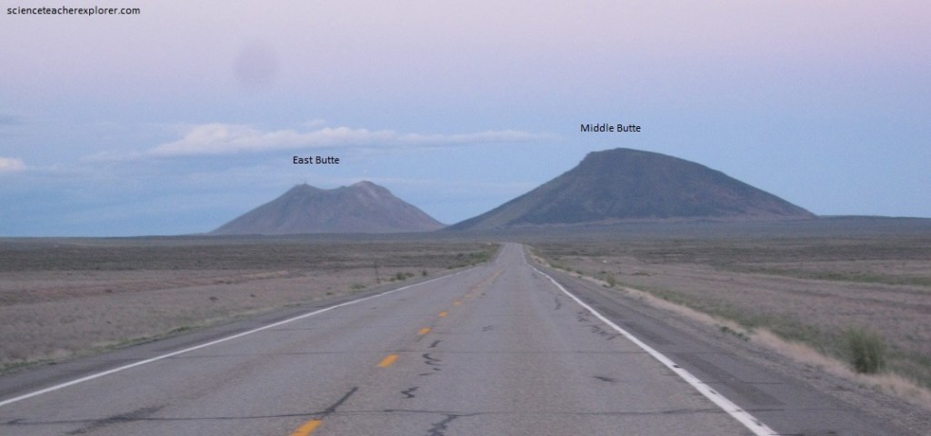 Pictured above, looking eastward from Atomic City and the “Big Southern Butte”, are two prominent buttes rising abruptly from the basaltic plains about 27 km away. The closer and rightmost of the two is Middle Butte, and the pointy butte topped with communication towers is East Butte. Along with Big Southern Butte, these form the three most prominent landmarks in the region. Like their big neighbor, both are lava domes, but Middle Butte lacks surface exposures of rhyolite and is cover by older basalt. Subsurface data suggests it is underlain by a shallow mass of rhyolite, which domed the basalt as it rose, creating the steep profile characteristic of lava domes. The three buttes are roughly aligned in a northeast direction, parallel to the Snake River Plain’s axis but at odds with the dominant northwesterly tren of other linear volcanic features and faults in the region.
