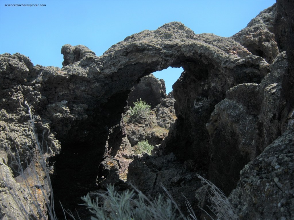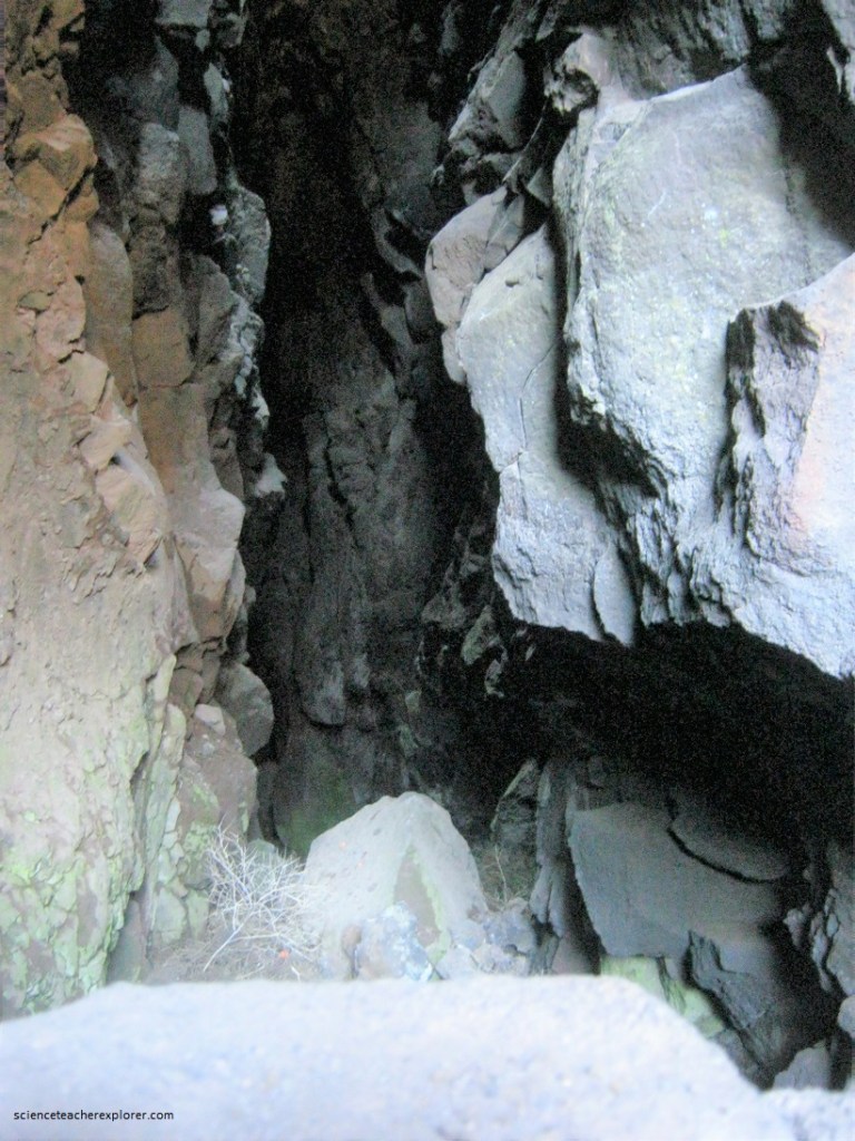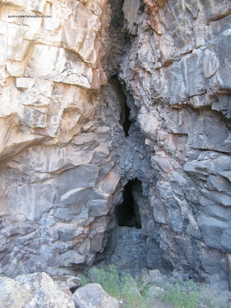 Pictured above and below, several such tunnels at Craters of the Moon are ridged inside with high-lava markings, (narrow benches that register the former positions of a succession of flow surfaces).