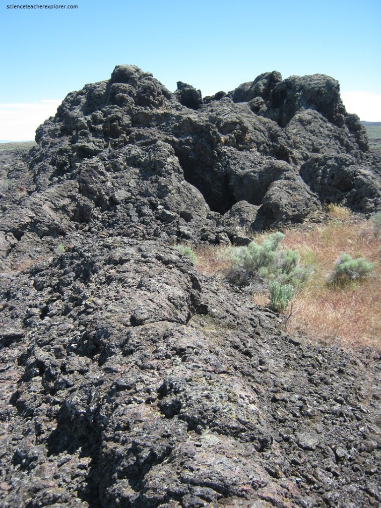 Flow surfaces are well preserved because of the dry climate and lack of soil and plant life. Pictured below, basalts lose heat rather rapidly when quickly traveling down hell from a source fissure, causing the flow surface to stiffen and fragment into a rough and jagged texture of a’a vesicles, (fossil bubbles formed by escaping gases), are ubiquitous in the rock.