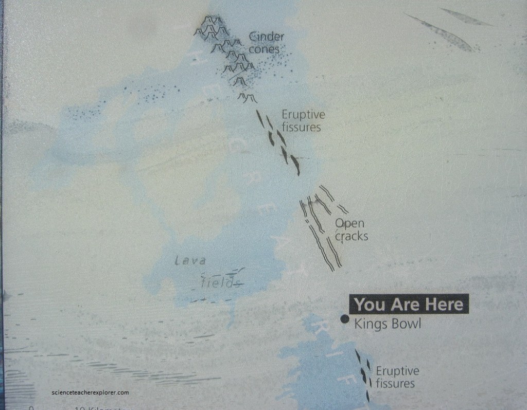 The eruption at the Kings Bowl location began about 2,200 years ago when magma ascended through a narrow, linear fracture and poured out as lava. This type of eruption, (known as a fissure eruption), differs markedly from other eruptions that emanated from a centralized vent.