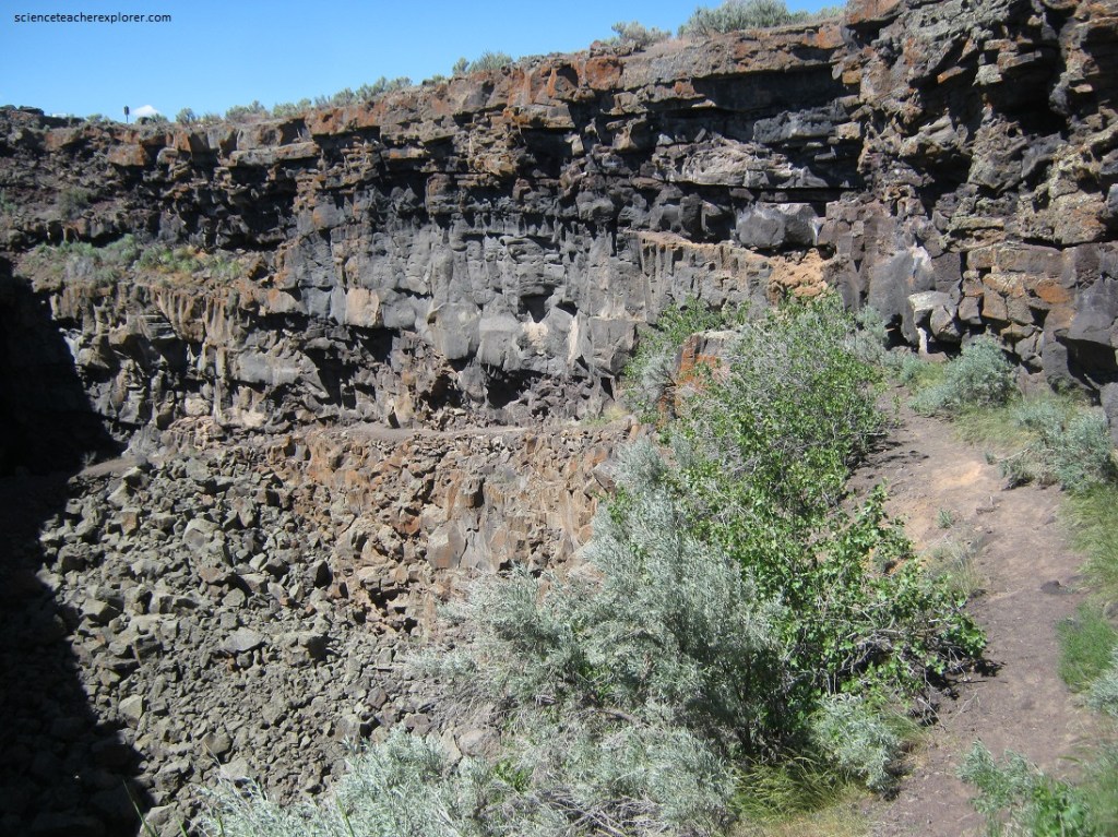 Pictured above, the eruption at Kings Bowl began about 2,200 years ago when magma ascended through a narrow, linear fracture and poured out as lava. This type of eruption, (known as a fissure eruption), differs markedly from other eruptions that emanated from a centralized vent. {Note that the layers of lava from earlier eruptions are visible in the crater walls. In some places, a combination of heat and water oxidized the lava, turning it red}.