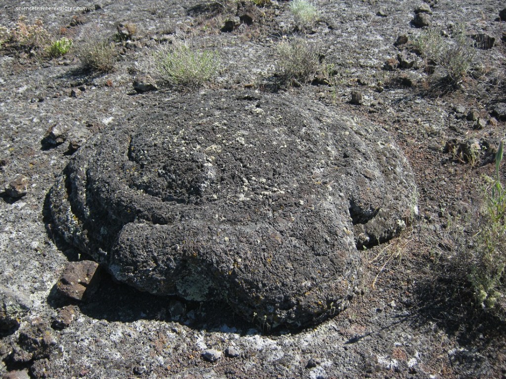 During the explosive phase of the eruption, a lava lake formed on the west side of the fissure where it was hemmed in by elevated terrain. As the surface of this lava lake began to solidify, a thin crust formed above it’s molten interior. Angular basalt blocks thrown from Kings Bowl struck the surface, penetrating the hardened crust. Through these openings, lava oozed out and cooled, forming the strange features called squeeze-ups.