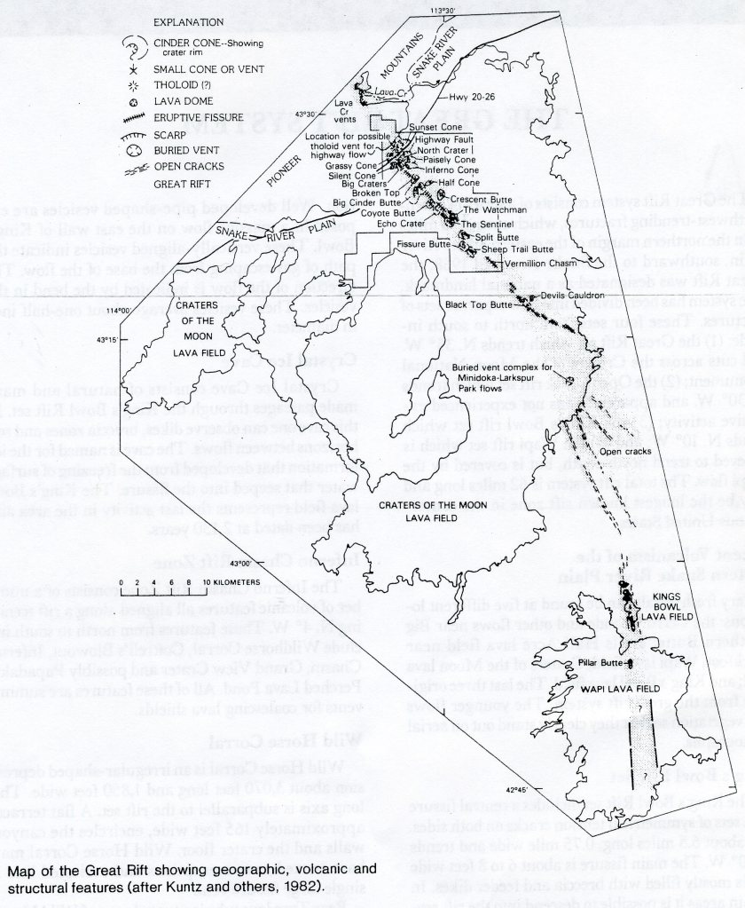 Pictured above, a double line of cinder cones stretches southeastward from the monument headquarters along two parallel fissures that cut the Snake River Plateau here in the national monument, and mark the so-called “Great Rift”. In the southeastern part of the monument some fissures are still partly open and visible as linear depressions in the lava surface. They show that the land here is still being pulled apart, (shown later below).