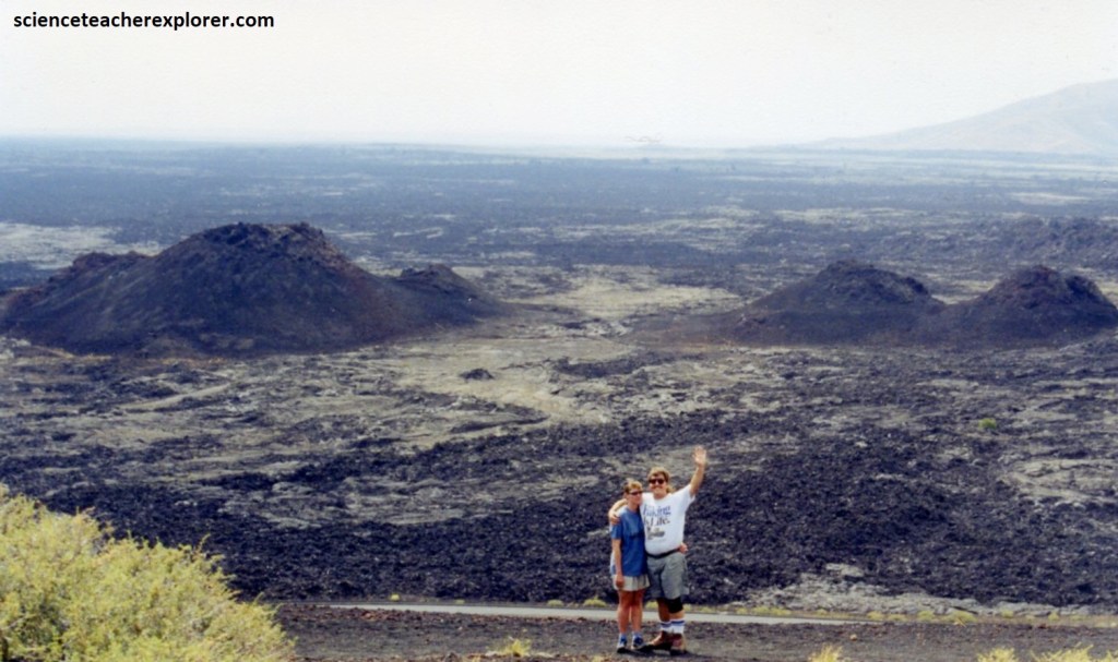 Smooth cinder cones and rough, uneven spatter cones ranging in age from 15,000 years to about 2,000 years rise above a sea of black basalt (lava) flows whose rope folds and jagged, blocky tops are so new they are not yet mantled in vegetation.