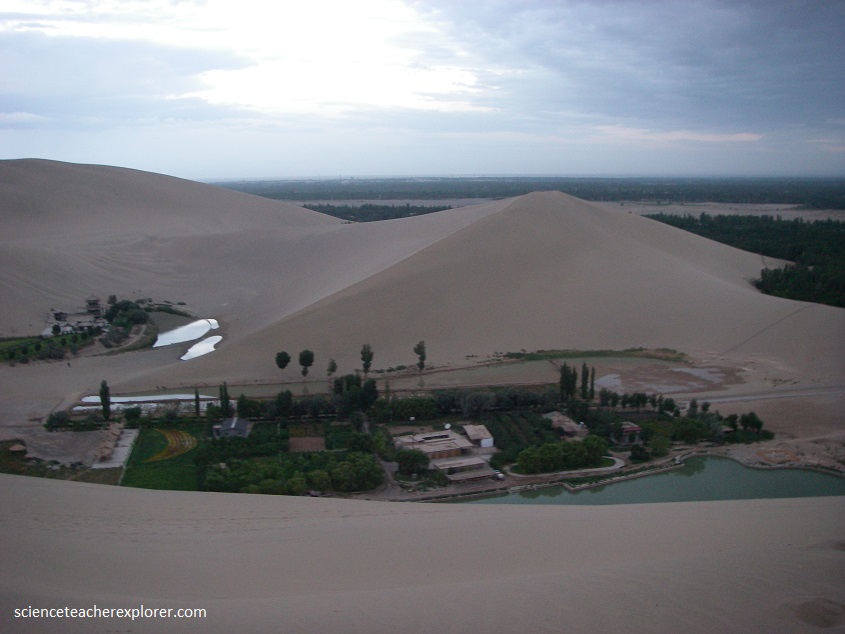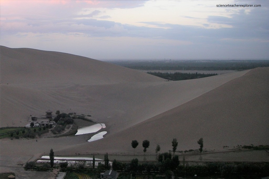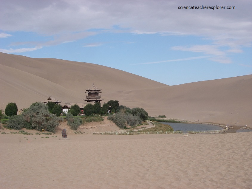Research shows that the mysterious crescent landform was the result of a natural wind created depression. As the cross-ventilation theory states, sands falling from the surrounding mountains would be blown to the other side of the nearby Echoing-Sand Mountain. Thus, the sands do not smother the spring. This natural phenomenon keeps the sand dunes and spring in a harmonious and almost paradoxical existence.