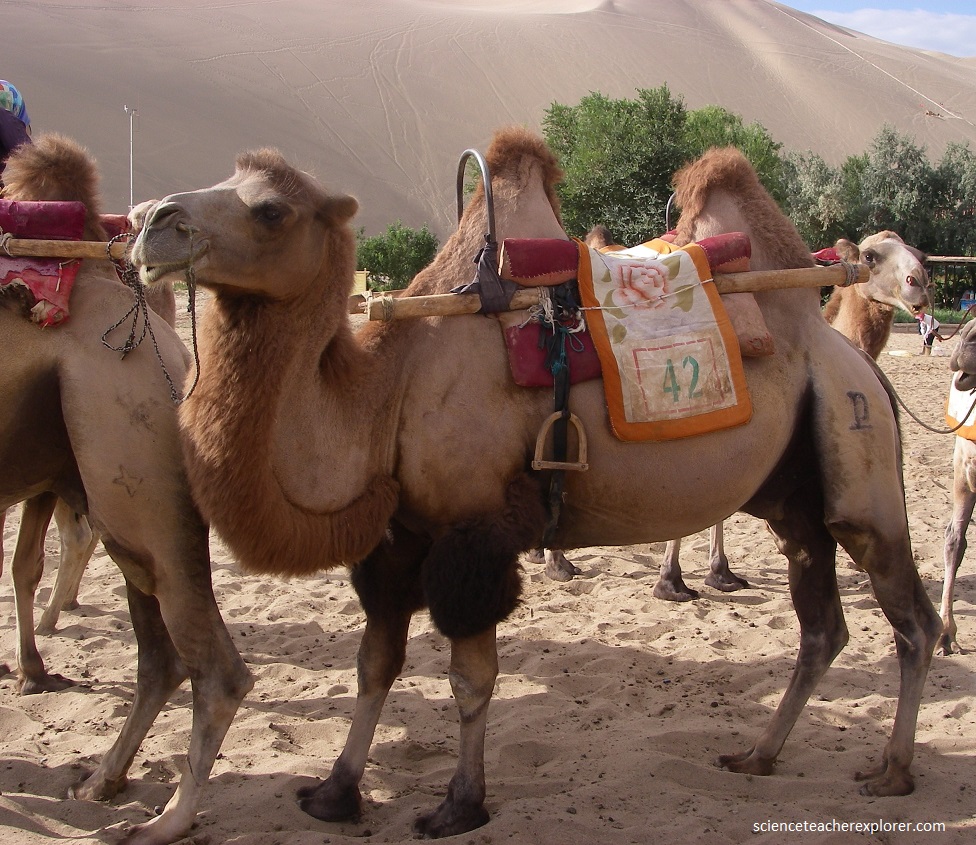 The Bactrian camel, also known as the Mongolian camel or domestic Bactrian camel, is a large even-toed ungulate native to the steppes of Central Asia. It has two humps on its back, in contrast to the single-humped dromedary camel. Its population of two million exists mainly in the domesticated form.