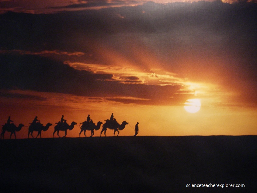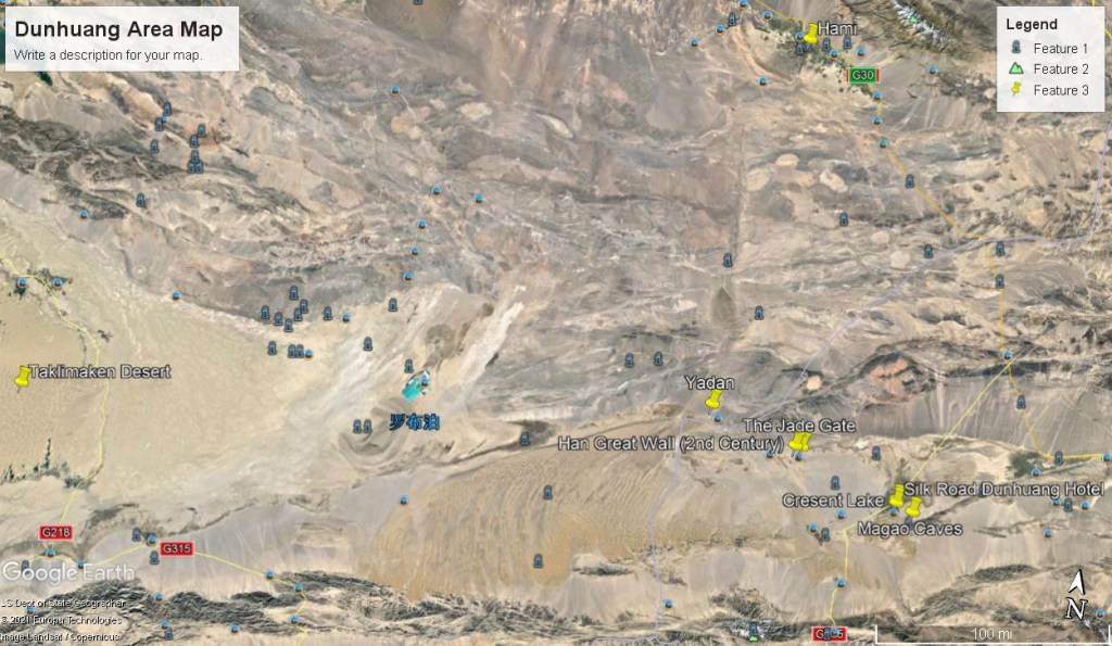 Confronted by great, pyramid-shaped sand dunes 300 m high, and even greater piles of sand when hurricane force winds pushed the sand even higher, the merchants traveling the “Silk Road” , skirted the area, relying on oases, such as Dunhuang and Crescenet Lake, on the eastern edge of the desert.