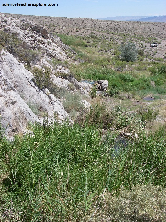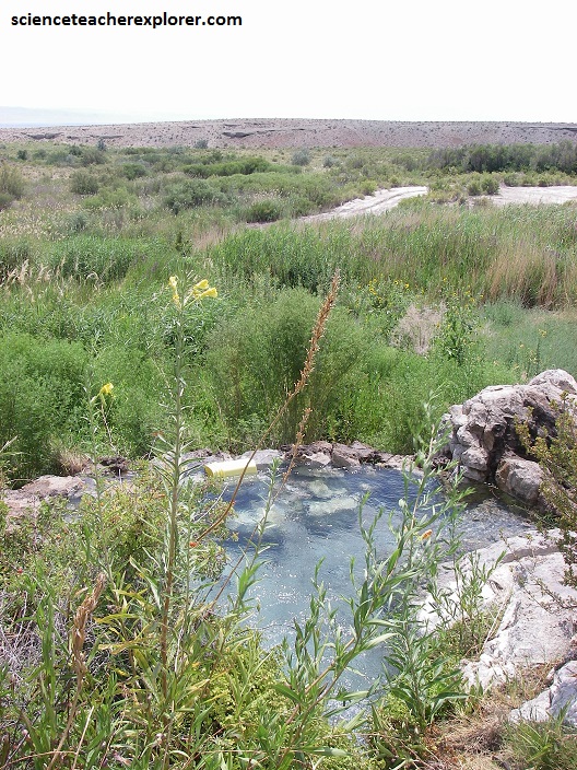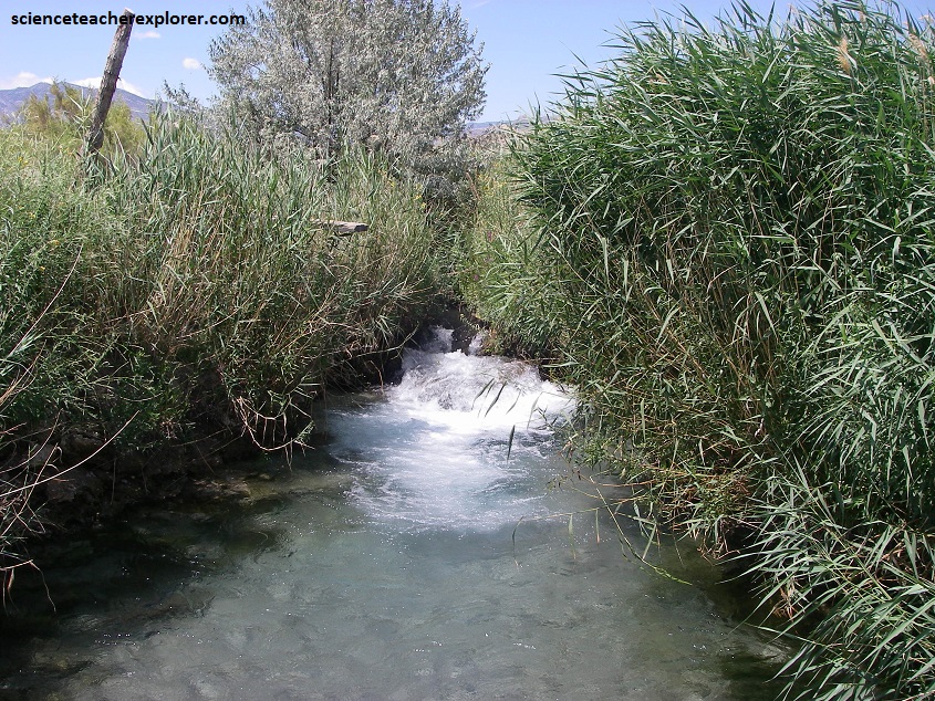 Possible conduits to the surface for the warm water are faults located in Snake Valley. Alternatively, the springs could flow from sediments containing groundwater that is forced to the surface by the bedrock barrier of the nearby Spring Mountain. Passageways through limestone bedrock could also channel groundwater to Gandy. Chemical analysis of the spring water’s isotopes suggests some older regional groundwater thousands of years old mixing with more recently recharged groundwater.