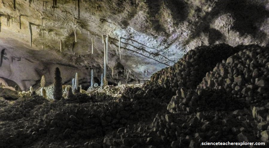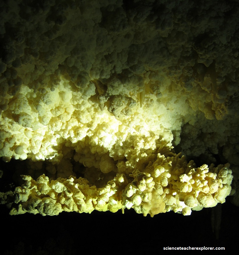 Several vertical cavities (domes) extend upward into the cave ceiling, and these predate the calcite precipitation because they are partly filled by it. Shift from dissolution to precipitation represents the drastic reduction in the carbon dioxide content of the groundwater necessary for calcite precipitation.