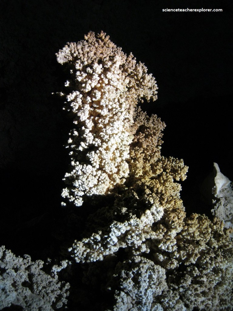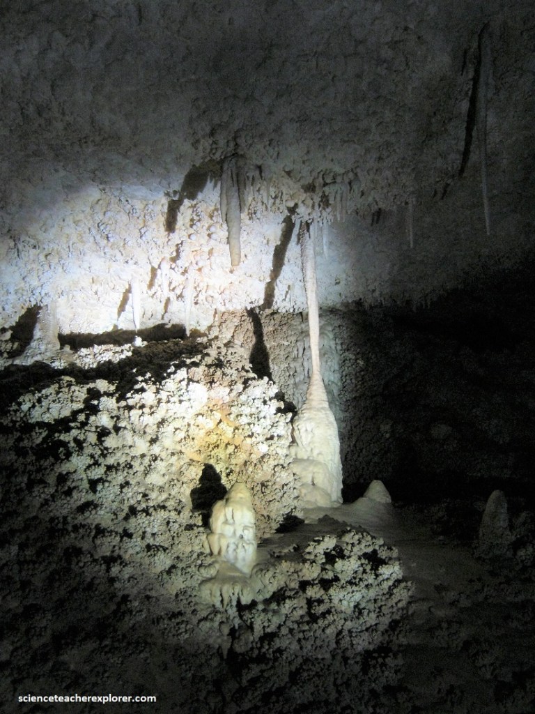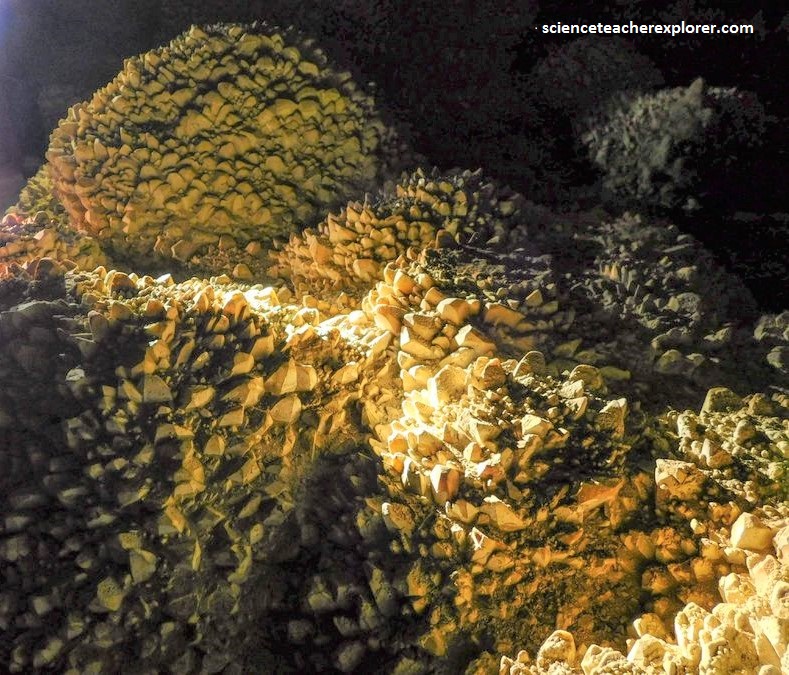 There are four distinct stages of the cave’s history: 1) a period of dissolution of limestone to form the cave, 2) a period of precipitation forming a layer of large calcite crystals (“nail head” spar) up to 0.3 meters thick on the cave walls, ceiling, and floor, 3) a period of partial dissolution of these crystals in the upper portions of the cave, the appearance of joints that cut the large calcite crystals, and the dislodging of breakdown from the ceiling of the large entrance room, and 4) the formation of vadose calcite speleothems and influx of sediment and fossils from outside the cave.