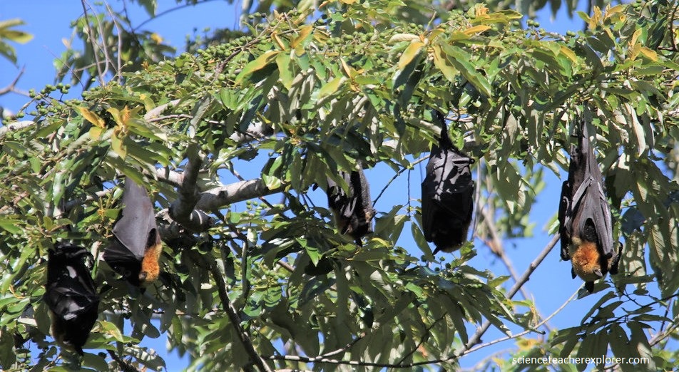 Pictured above, Pteropus (suborder Yinpterochiroptera) is a genus of megabats which are among the largest bats in the world. They are commonly known as fruit bats or flying foxes, among other colloquial names. Flying foxes eat fruit and other plant matter, and occasionally consume insects as well. They locate resources with their keen sense of smell. Most, but not all, are nocturnal. They navigate with keen eyesight, as they cannot echolocate. They have long life spans and low reproductive outputs, with females of most species producing only one offspring per year. Their slow life history makes their populations vulnerable to threats such as overhunting, culling, and natural disasters. They are ecologically beneficial by assisting in the regeneration of forests via seed dispersal. They benefit ecosystems and human interests by pollinating plants.