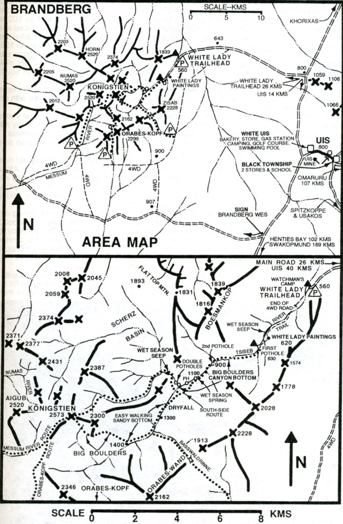 As mentioned, Brandberg Mountain is a great granite massif that rises to nearly 2,700m at the Konigstein, Namibia’s highest point. The mountain is nearly circular with a radius of about 30km and consists of a wilderness of huge boulders and dramatic cliffs. Pictured above, various gorges offer routes into this formidable world but there are no natural springs on the mountain.