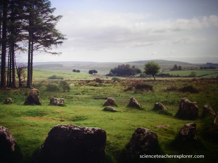 There are numerous prehistoric standing stone circles found within the park. Pictured above, on Soussons (Southsands) Common, near Postbridge, is a spherical circle 10 m in diameter. The stones are 22 in number, – not large stones, – the tallest is about 75 cm above ground-level. On digging in the centre a fine kistvaen was uncovered. The cover stone was gone, but side stones of thin, shapely slabs remain. The north end of the kist was built up of small stones, and the south end was formed of a stone which did not reach the floor of the kist by some 6 cm. It, however, acted as a blocking stone and “spreader” to the side stones.