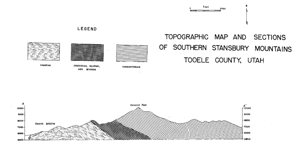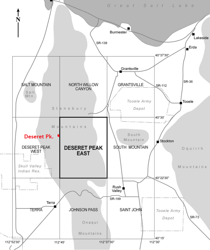 Rocks on the east and southeast slopes of the Stansbury Range are mostly limestone, while the greater part of the range, and Deseret Peak, is made of quartzite.