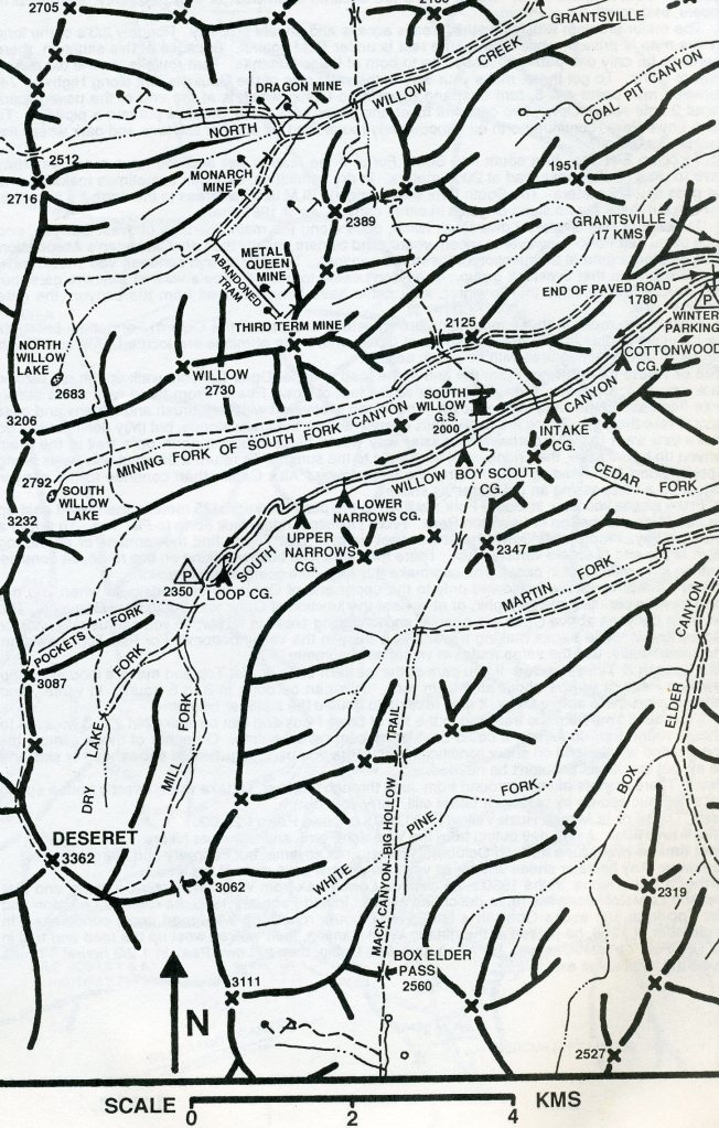To get there, we drove on I-84 to Grantsville. At 400 West street, we turned south and drove 10 km when the road veered southwest at the fork. We following the sign to South Willow Canyon for another 6 km to the forest boundary sign.