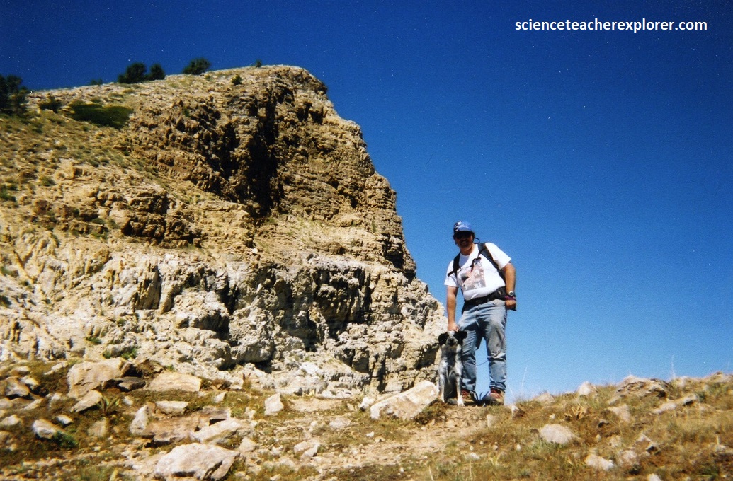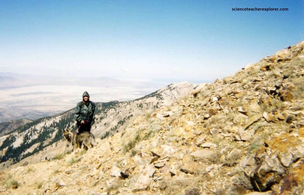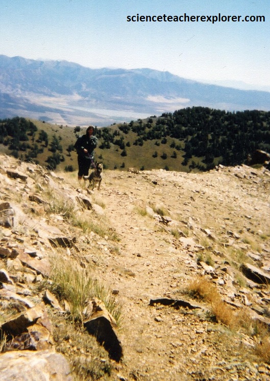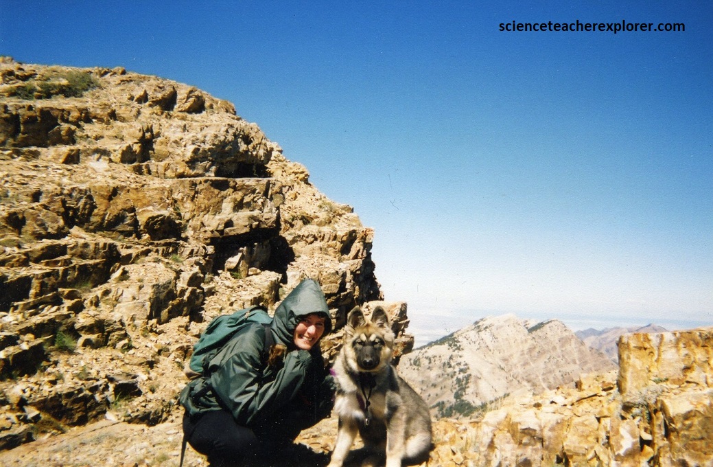 The Tintic Quartzite represents the oldest unit exposed on the trek and is well exposed along the high crest of the range, (include Deseret Peak), where it forms the hinge zone and west-limb of the Deseret anticline for nearly the entire length of the range. The lowermost part was a light-pink, brown and maroon quartzite-clast conglomerate. The majority of the unit was thin to thick-bedded, light gray to light tan quartzite, commonly weathered reddish-brown with hematite staining. The uppermost section is a reddish-brown, medium to thick-bedded, medium to coarse-grained pebbly quartzite. Pictured below are photos looking upward towards the Tintic Quartzite Deseret Peak from the top ridge. Both photos are looking northwest at Becky with Lakota and myself with Blue.