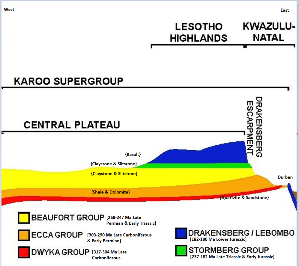 The Drakensberg rifting resulted in a flood of igneous lavas called the Lesotho Formation solidifying to a depth of a kilometer or more over the region now known as Lesotho Highlands. Over millions of years, erosion eventually formed the peaks, passes and valleys which we see today as the Lesotho highlands & the formation of the “Great Escarpment”, (imaged below).